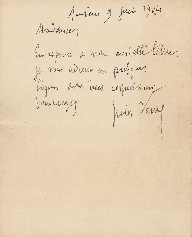 ALS in French, one page, 4.25 x 5.25, June 9, 1904. Untranslated handwritten letter from Verne extending his thanks for a friendly letter. In fine condition. A neatly penned letter that dates to the twilight of the great author's life.