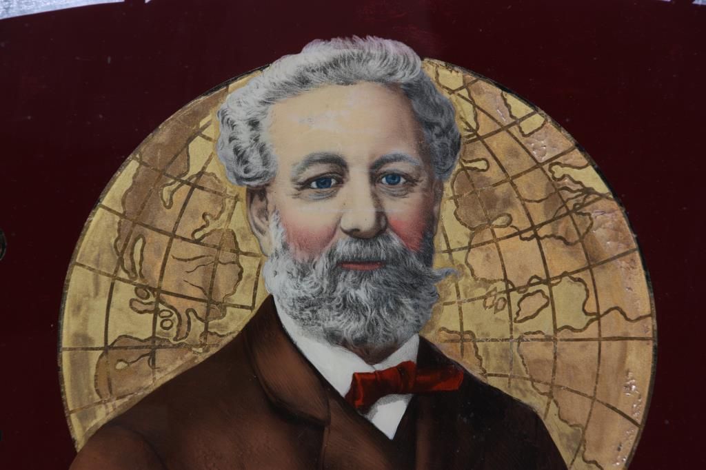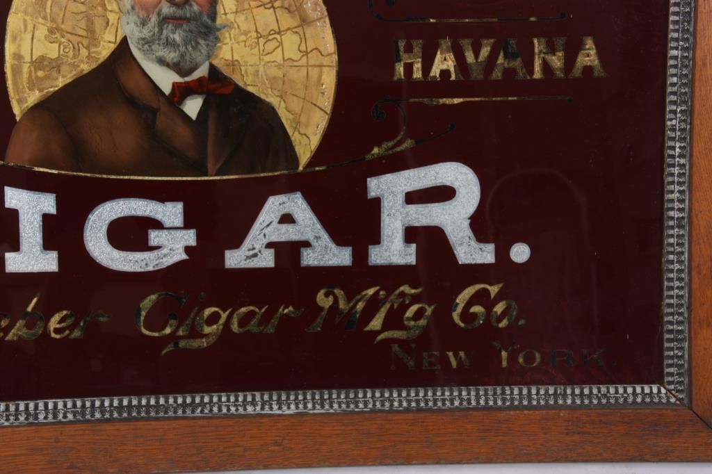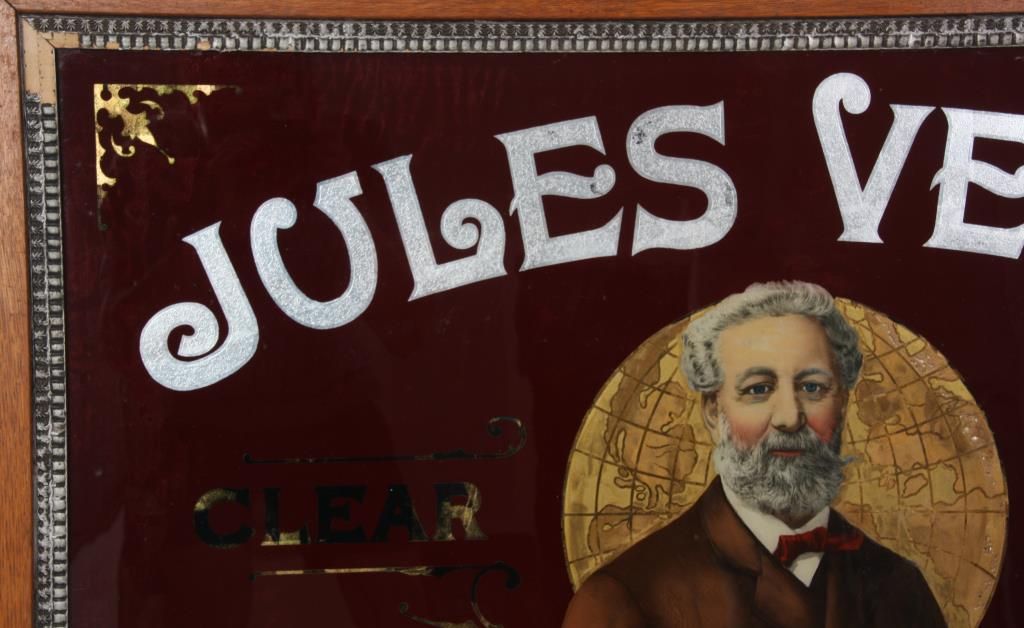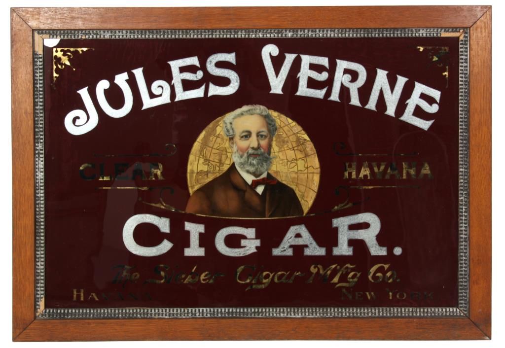 Jules Verne Cigars Reverse Painted Sign. Rare sign, reverse painted on glass, has a maroon background with mirrored and silvered decal lettering reading “Jules Verne Cigars” and gilt lettering reads “Clear Havana, The Sieber Cigar Mfg. Co., Havana New York”. Centered is a portrait of a man in front of a world globe. Has some minor staining to the paint, but overall good condition, 23.5 in. high x 35.5 in. wide.