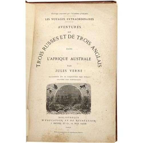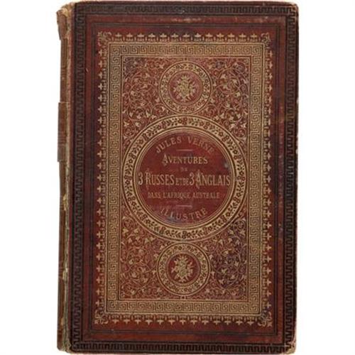 <B>Jules Verne. </B></I><B><I>Les Voyages Extraordinaires. Adventures de Trois Russes et de Trois Anglais L' Afrique Australe</B></I></B></I><B>.</B></I> Paris: J. Hetzel et Cie, [no date].<BR> <BR>Unknown edition. Quarto. 202 pages. Engravings by J. Ferat. French text.<BR><BR>Original pictorial cloth with decoration and titles stamped in gilt and black on the boards and spine. All edges gilt. Boards worn especially the corners. Front board about detached. Sections of spine torn and in need of conservation. Contents toned and foxed throughout. Good condition.<BR><BR><BR><b>Shipping:</b> Books & Catalogs (<a target="_blank" href="http://www.heritageauctions.com/common/shipping.php">view shipping information</a>)