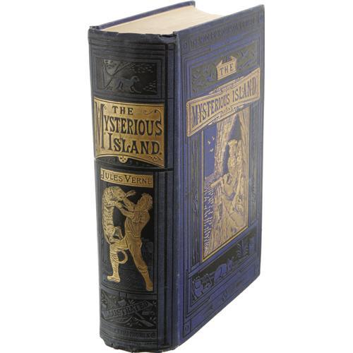 <B>Jules Verne:<I> The Mysterious Island, The Modern Robinson Crusoe.</B></I></B></I> (New York: Scribner, Armstrong, & Company, 1876), first omnibus edition, 299 pages, 145 illustrations, blue pictorial cloth with gilt decoration, 8vo (6" x 8.25"), beautiful bright covers, internal contents sound and bright, corners lightly bumped, an attractive copy of this enduring work. Originally published in three parts, this is the first collected edition. This copy is offered in a custom-made slipcase. <I>From the Ventura Collection.</B></I><BR><BR><b>Shipping:</b> Books & Catalogs (<a target="_blank" href="http://www.heritageauctions.com/common/shipping.php">view shipping information</a>)