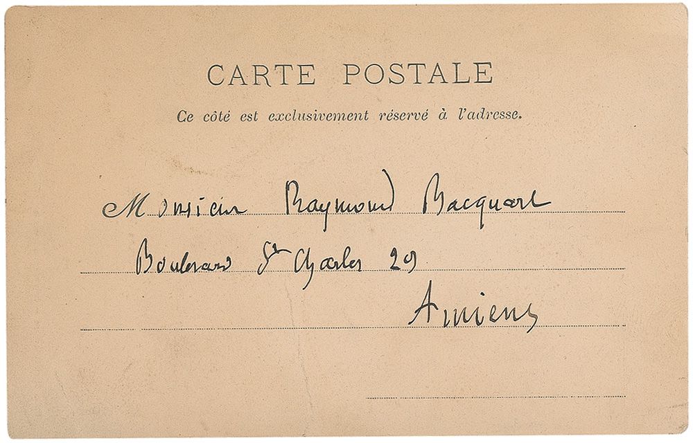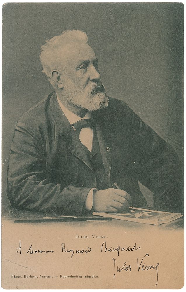 French writer (1828–1905) whose classic novels, including Voyage to the Center of the Earth and Twenty Thousand Leagues Under the Sea, helped lay the foundations for the science fiction genre. Scarce vintage 3.5 x 5.5 postcard photo of Verne seated at a table, pen in hand, signed and inscribed in black ink “A Monsieur Raymond Bacquarl, Jules Verne.” In fine condition, with a couple creases to left edge. Verne is extremely desirable in any form.