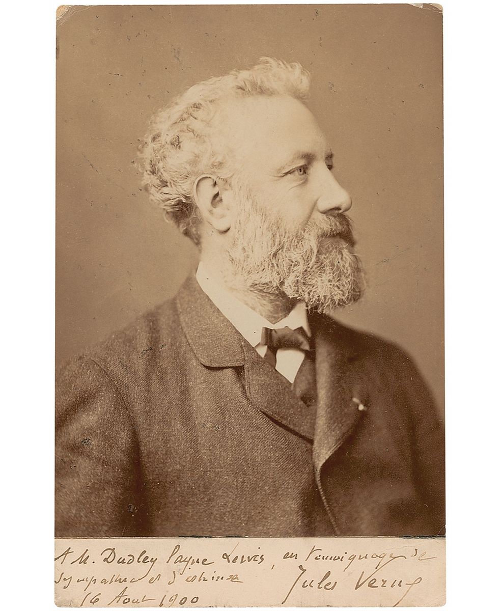 French writer (1828–1905) whose classic novels, including Voyage to the Center of the Earth and Twenty Thousand Leagues Under the Sea, helped lay the foundations for the science fiction genre. Original 4 x 6 cabinet bust portrait of Verne, signed and inscribed on the mount in black ink to Dudley Payne Lewis, and dated August 16, 1900. Published by Nadar of Paris. Some slight creasing to the signature area, trimmed edges, and mounting remnants to reverse, otherwise fine condition; the overall image quality is superb, with even the finest details of the twill of his jacket visible. Accompanied by two clipped articles about Verne. This is one of a scant few Verne portraits we have offered, and the author is extremely desirable in any form.