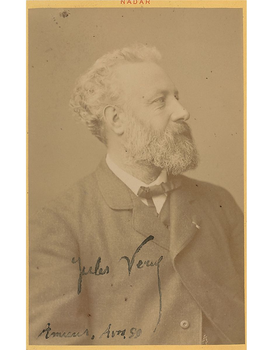 Original 2.25 x 3.5 carte-de-visite head-and-shoulders photo by Nadar, signed in black ink, “Jules Verne, Amiens, Avril 99.” In fine condition, with slightly trimmed edges and some small mounting remnants to reverse. Verne was in the midst of a 15-year stint as town councilor of Amiens, having entered politics in 1888. This is one of only a few Verne portraits we have offered, and the author is extremely desirable in any form.