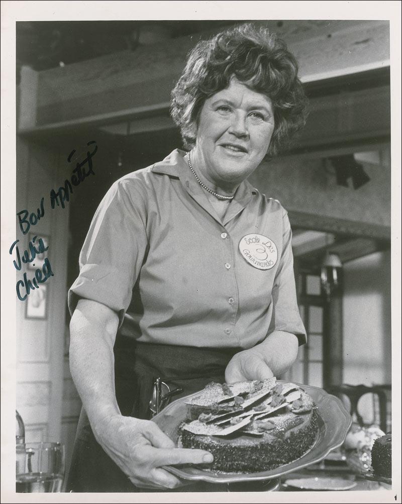 Glossy 8 x 10 photo of Child holding out a delicious cake, signed in black felt tip, “Bon Appetit, Julia Child.” In fine condition, with a few scattered dings and some light streaking to emulsion.