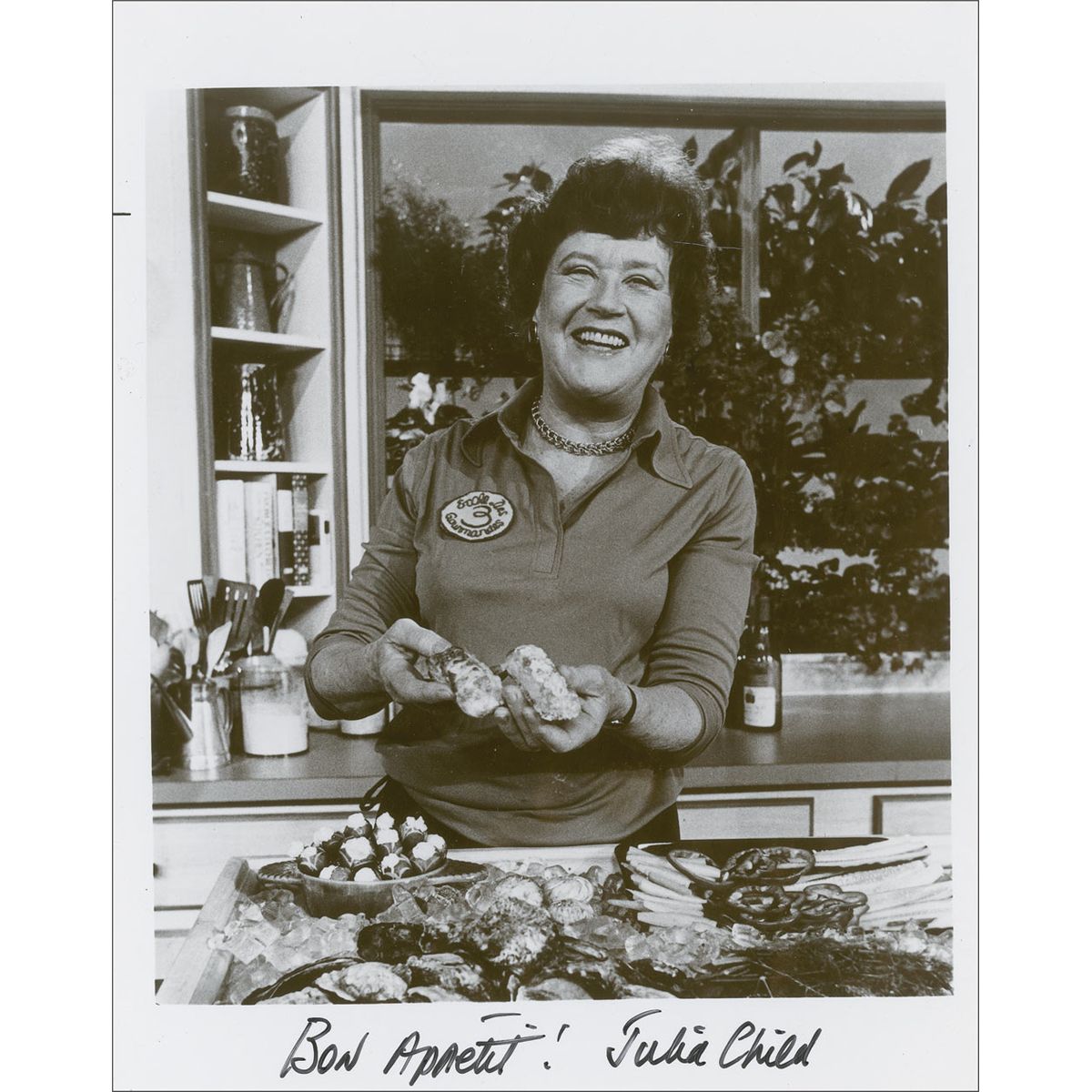Glossy 8 x 10 photo of Child in the kitchen, signed in black felt tip, “Bon Appetit! Julia Child.” In fine condition, with some surface dings.