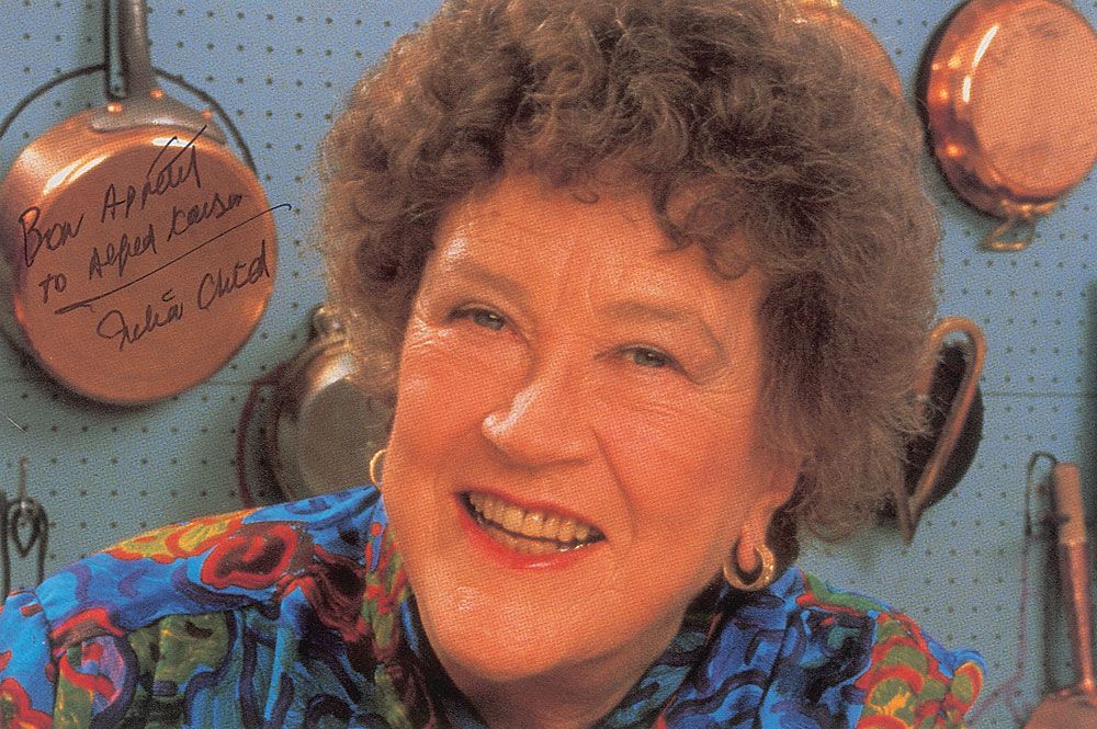 Color 7.25 x 5 cardstock close-up photo, signed and inscribed in black ink, “Bon appetit to Alfred Kaiser, Julia Child.” In fine condition.