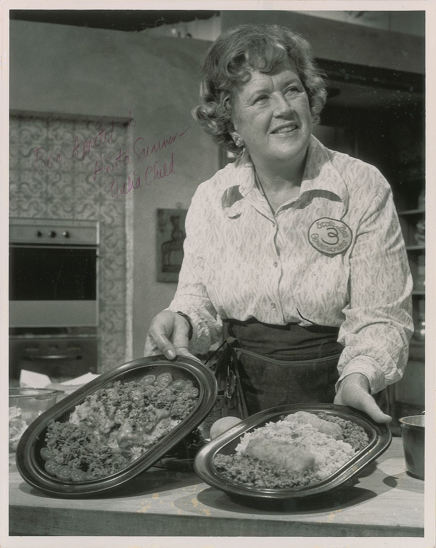 Glossy 8 x 10 photo of Child showing off two freshly cooked meals, signed and inscribed in black felt tip, "Bon Appetit to Anita Summer—Julia Child.” In fine condition.