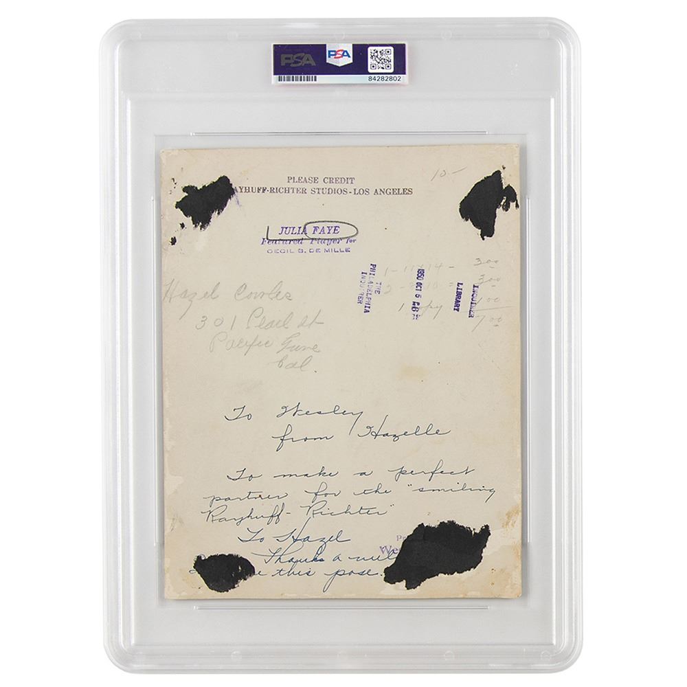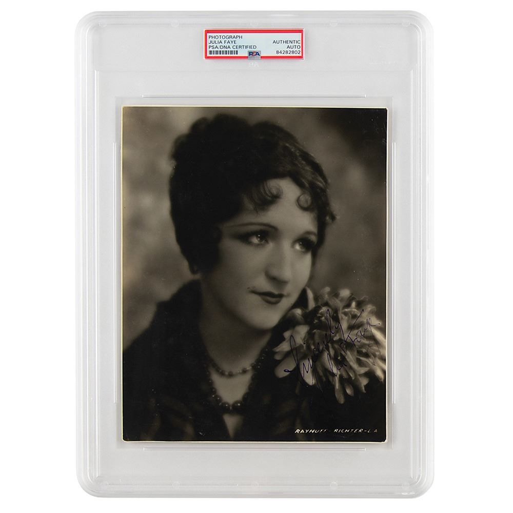 Vintage glossy 7.25 x 9 close-up photo of the silent actress who often starred in Cecil B. DeMille& #39;s films, signed in fountain pen, "Sincerely, Julia Faye." Reverse bears a Richter Studios credit stamp. In fine condition, with trimmed borders. Encapsulated in a PSA/DNA authentication holder.
