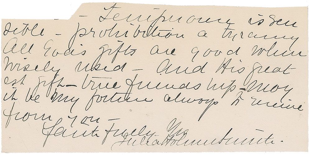 American physician and woman’s rights advocate. AQS on an off-white 5.5 x 2.75 clipped sheet. Smith writes, in full: “Temperance is sensible—prohibition a tyranny. All God’s gifts are good when wisely used—and His greatest gift—true friendship—may it be my fortune always to receive from you.” In fine condition.