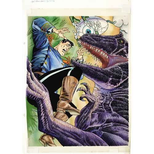 <B>Julia Lacquement - Captain Sternn: Running Out of Time #2 Splash Page 45 and 46 Color Guide Original Art (Kitchen Sink, 1993).</B></I> Julia Lacquemont's richly hued watercolor took full advantage of the "blue line" printing process to create full-spectrum effects for Bernie Wrightson's lighthearted space opera. Wrightson's black line art is reproduced on an acetate overlay. The image area of this page is 18" x 14", and the art is in Excellent condition.