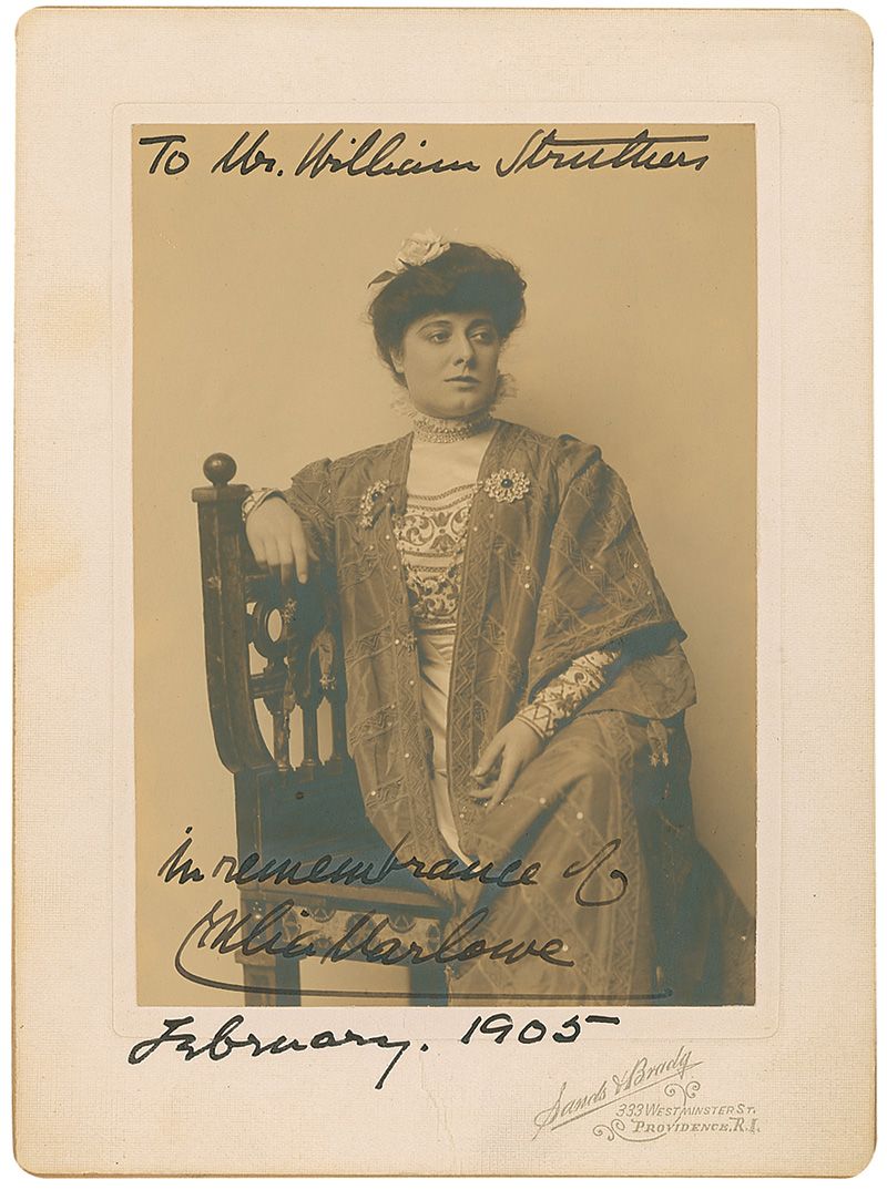 English-American actress (1866–1950) best known for her interpretations of Shakespearean roles. Vintage matte-finish 3.75 x 5.5 photo by Sands and Brady of Providence, Rhode Island, affixed to its original 5.25 x 7.25 mount, signed and inscribed in black ink “To Mr. William Struthers in remembrance of Julia Marlowe, February 1905.” Light silvering to darker portions of image and some light creasing and toning to bottom border, otherwise fine condition.