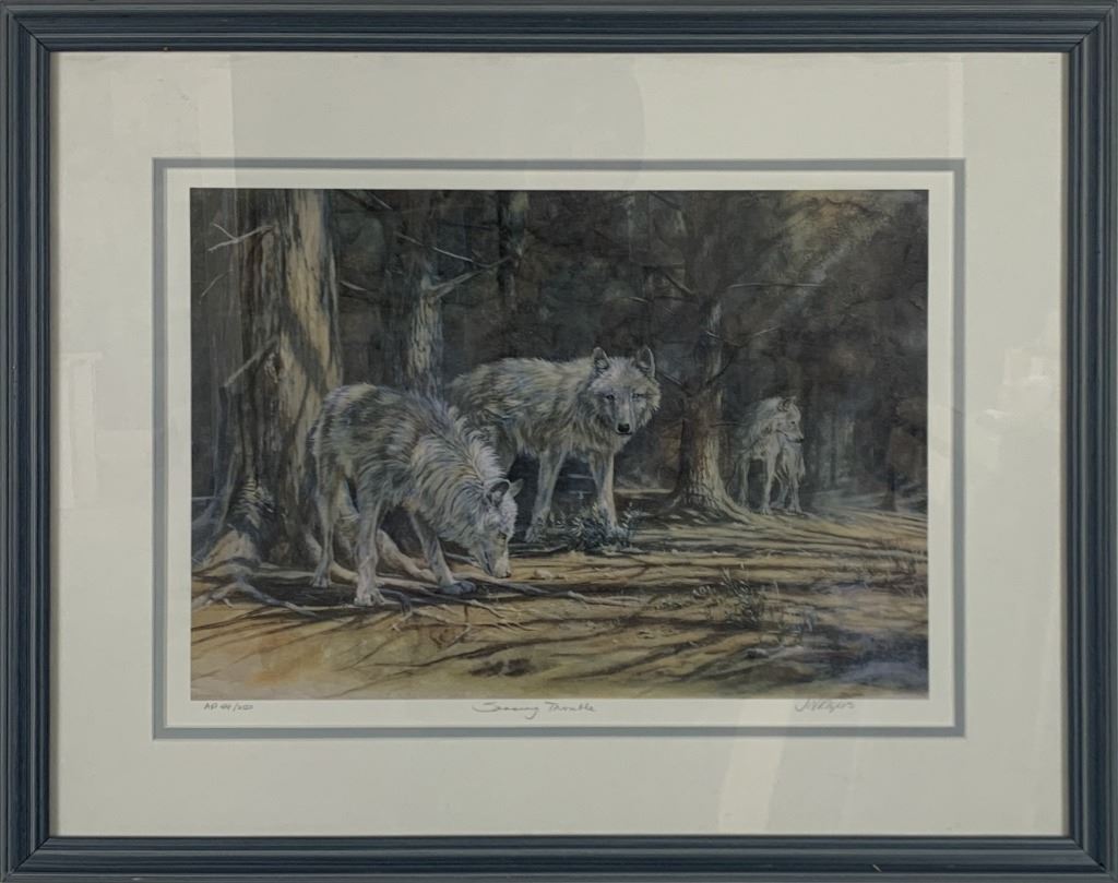 Julia Rogers' "Sensing Trouble" limited edition artist proof print, signed lower right, and numbered AP 44/250. A nice piece of three wolves in the forest, and something has caught the middle wolf's attention, as he is 'sensing trouble'. This piece has been professionally double matted with acid free matting, and has been custom framed under glass.
