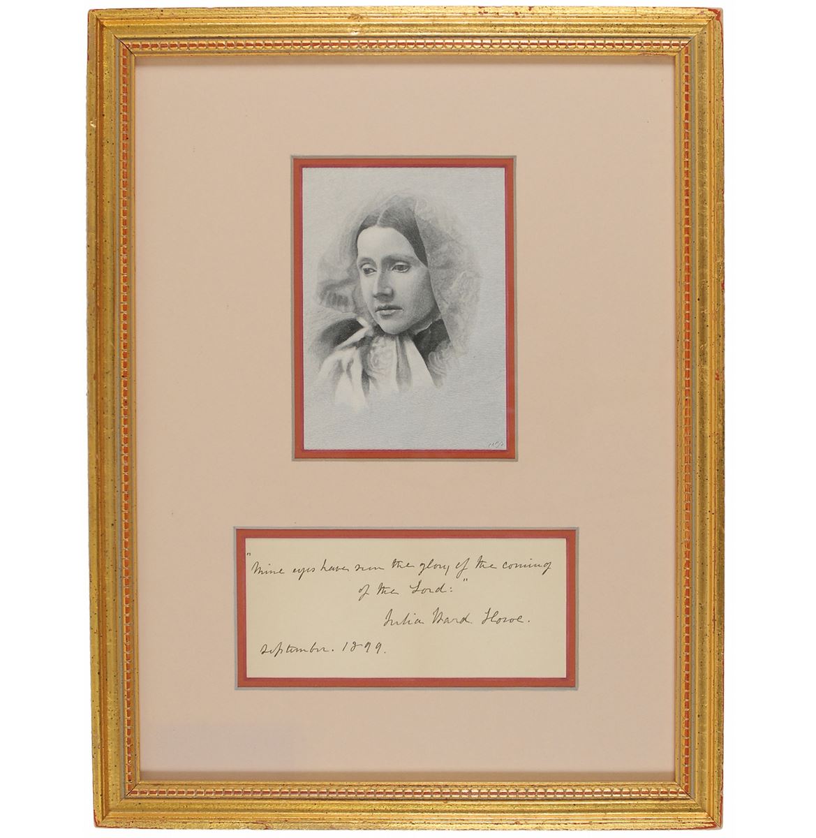 Boldly penned AQS on an off-white 6.25 x 2.75 slip, signed at the conclusion, “Julia Ward Howe, September, 1899.” Howe pens a line from her most famous patriotic verse, ‘The Battle Hymn of the Republic.’ In full: “‘Mine eyes have seen the glory of the coming of the Lord.’” Nicely double-matted and framed with an engraved portrait to an overall size of 12.25 x 16. In fine condition, with a central vertical fold. A fabulous example of this iconic quote.