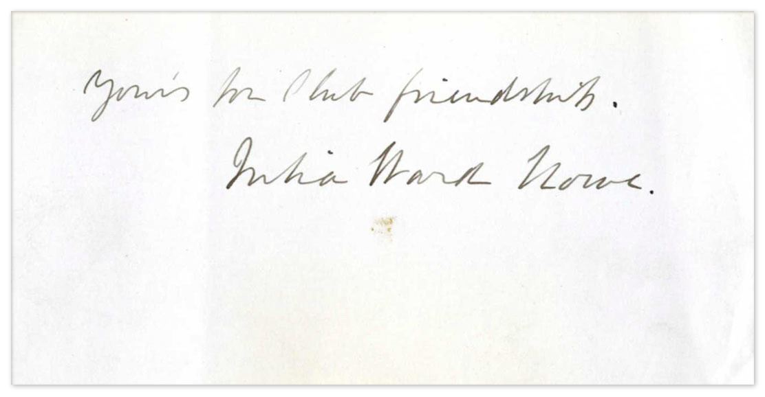 19th century American social activist Julia Ward Howe signed slip. Howe's autograph inscription reads in full, ''Your's for Club Friendship / Julia Ward Howe''. Measures 6.5'' x 4.25''. Some evidence of prior mounting to verso. Very good.