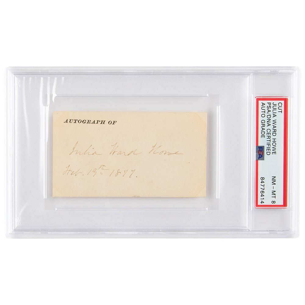 Attractive ink signature, "Julia Ward Howe, Feb. 19th, 1877,& rdquo; on an off-white 3.75 x 2 autograph card. In fine condition. Encapsulated and graded by PSA/DNA as "NM-MT 8."
