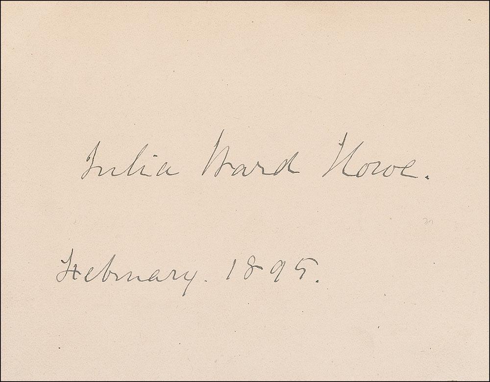 Vintage fountain pen signature, “Julia Ward Howe, February 1895,” on an off-white 4 x 3 sheet. In fine condition.