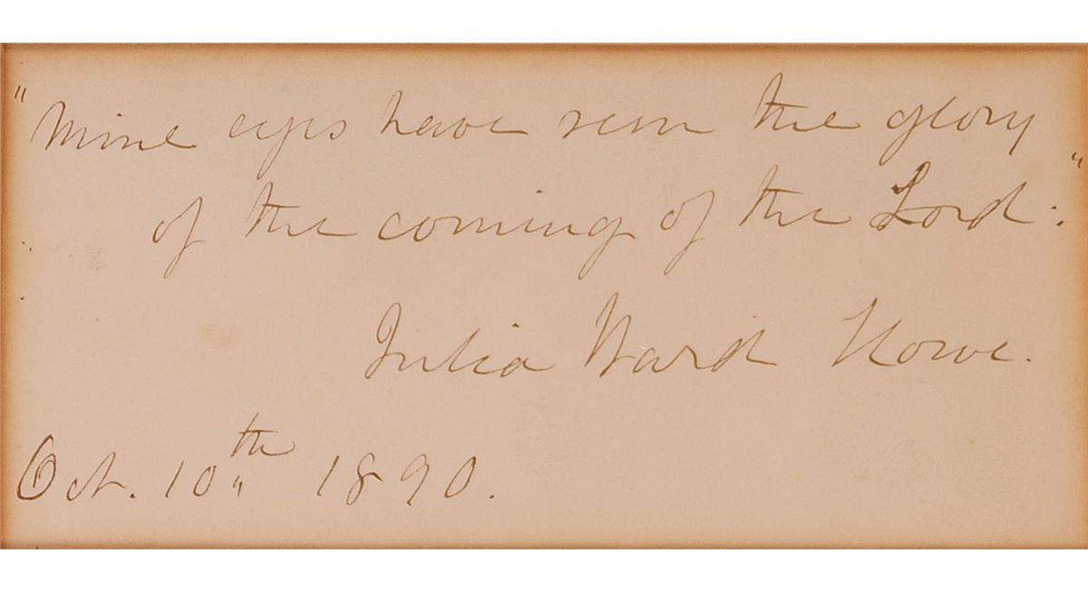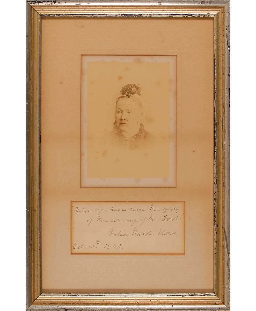 AQS on an off-white 5.25 x 2.5 sheet. Ward pens the opening line from ‘The Battle Hymn of the Republic.’ In full: “’Mine eyes have seen the glory of the coming of the Lord.’” Signed underneath, “Julia Ward Howe, Oct. 10th 1890.” Matted and framed with an unsigned vintage portrait, to an overall size of 9.5 x 14.5. Uniform overall toning, a bit heavier to edges, and foxing to portrait otherwise very good condition.