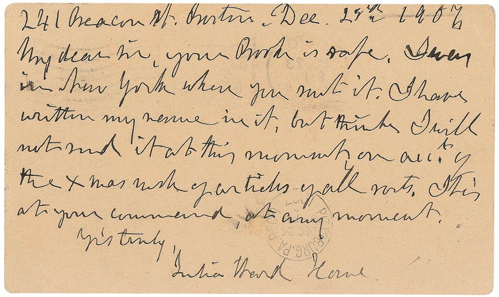 ALS, one page on a government postcard, 5.5 x 3.25, December 13, 1907. Letter to an admirer. In part: “Your book is safe. I was in New York when you sent it. I have written my name in it, but think I will not send it at this moment on acct of the Xmas rush of articles of all sorts.” Howe also addressed the postcard in her own hand. A few light creases, staple holes to the lower right corner, and a couple light cancellation stamps affecting parts of the text, otherwise fine condition.