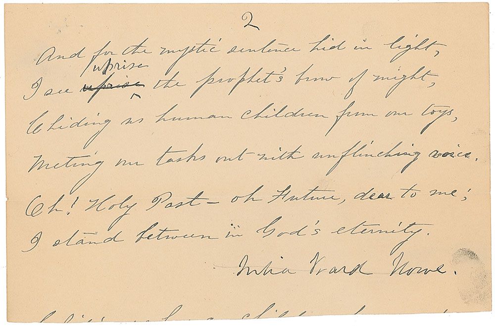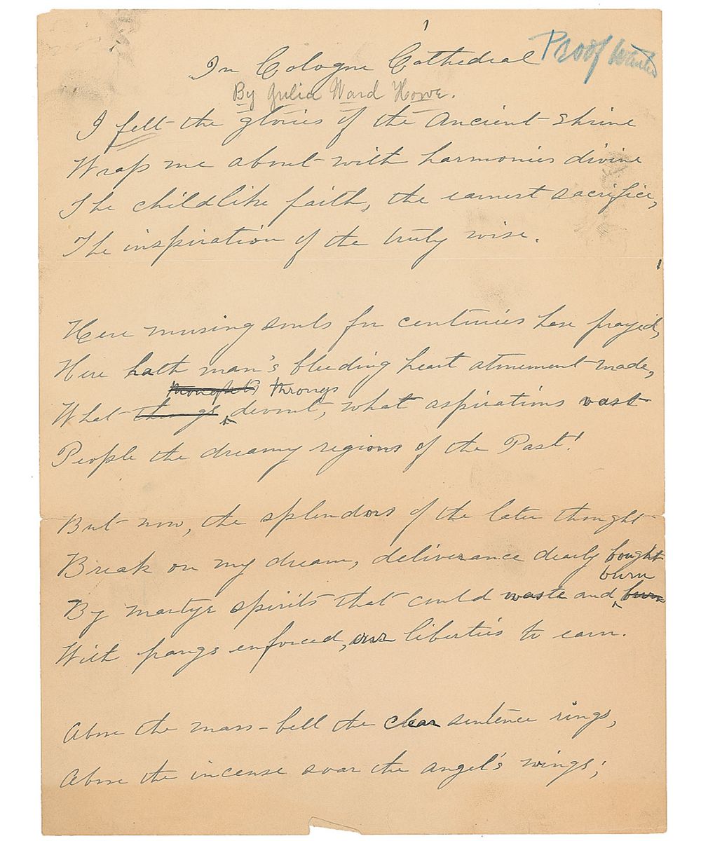 Autograph draft of a poem, signed “Julia Ward Howe,” two pages (7.75 x 10.25 and 7.75 x 5), no date. The poem, titled “In Cologne Cathedral,” reads in full: “I felt the glories of the ancient shrine / Wrap me about with harmonies divine / The childlike faith, the earnest sacrifice, / The inspiration of the truly wise. / Here missing souls for centuries have prayed, / Here hath man's bleeding heart atonement made, / What throngs devout, what aspirations vast / People the dreamy regions of the Past! / But now, the splendors of the later thought / Break on my dream, deliverance dearly bought / By martyr spirits that could waste and burn / With pangs enforced, our liberties to earn. / Above the mass-bell the clear sentence rings, / Above the incense soar the angel's wings / And for the mystic sentence hid in light, / I see uprise the prophet's brow of might / Chiding us human children from our toys, / Meeting our tasks out with unflinching voice / Oh! Holy Past—oh Future, dear to me; / I stand between in God's eternity.” There are corrections over several words, indicating that this was a draft of the final poem and not a commemorative copy. In very good condition, with trimming to second page, light toning, a few smudges, wrinkles, and pinholes, and faint pencil stroke through signature.