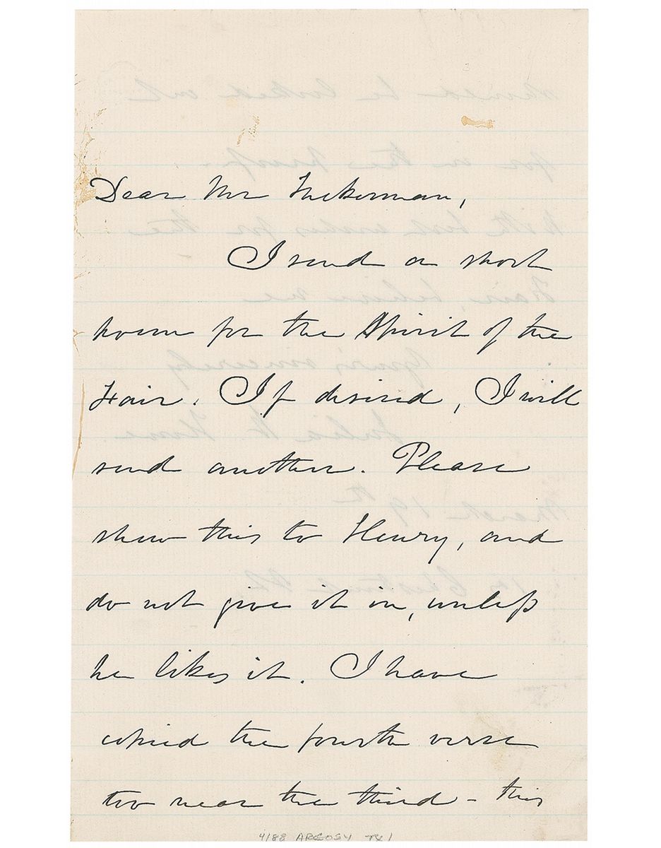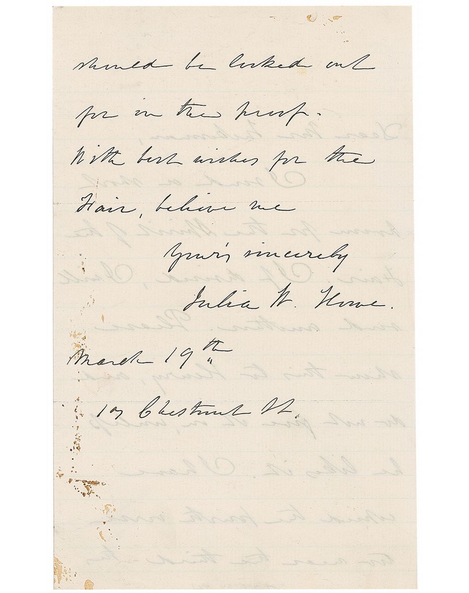 Author, suffragette, dramatist, poet, and biographer (1819–1910), best remembered as the lyricist of ‘Battle Hymn of the Republic.’ Civil War–dated ALS signed “Julia W. Howe,” one page, lightly-lined both sides, 4.75 x 8, March 19, [1864]. Letter to a Charles K. Tuckerman of the editorial committee of Spirit of the Fair. In part: “I send a short poem for the Spirit of the Fair. If desired, I will send another…I have copied the fourth verse too near the third—this should be looked out for in the proof…best wishes for the Fair.” In fine condition, with trivial adhesive remnants to the left border (not affecting the signature or body of the letter). Accompanied by an unsigned original carte-de-visite portrait of Howe. The poem Howe refers to is ‘Victory,’ which was prepared expressly for Spirit of the Fair, a periodical published in conjunction with the New York Metropolitan Fair in May 1864.