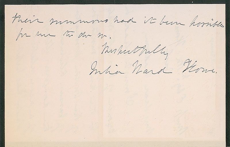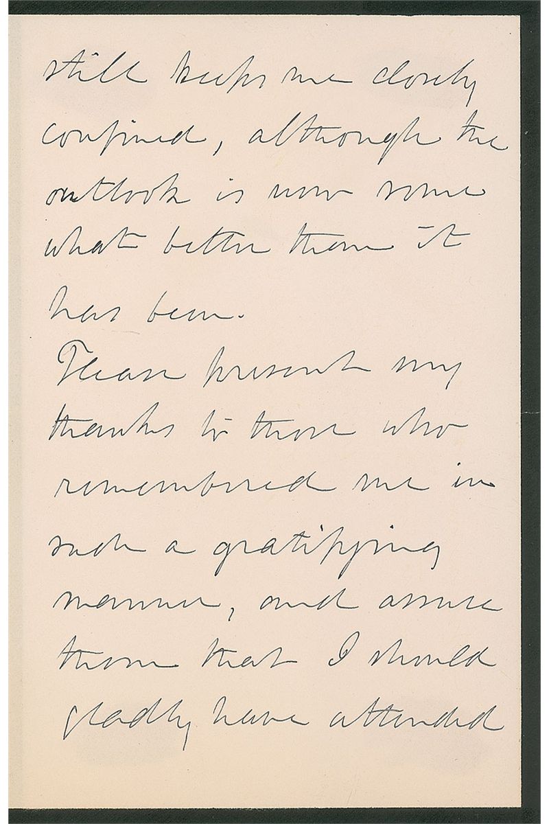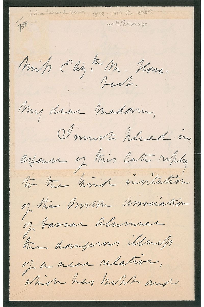 ALS, three pages on two adjoining black-bordered sheets, 4.5 x 6.75, no date. Letter to Elizabeth M. Howe of Cambridge. In part: “To the kind invitation…Please present my thanks…and assure them that I should have attended…had it been possible for me to do so.” Moderate blocks of toning to first page, otherwise fine condition. Accompanied by the original mailing envelope, filled out in Howe’s hand.