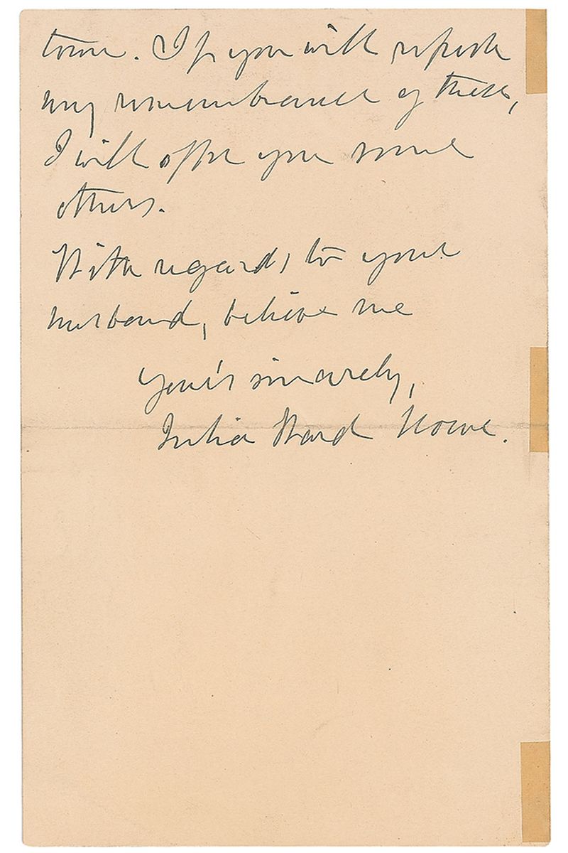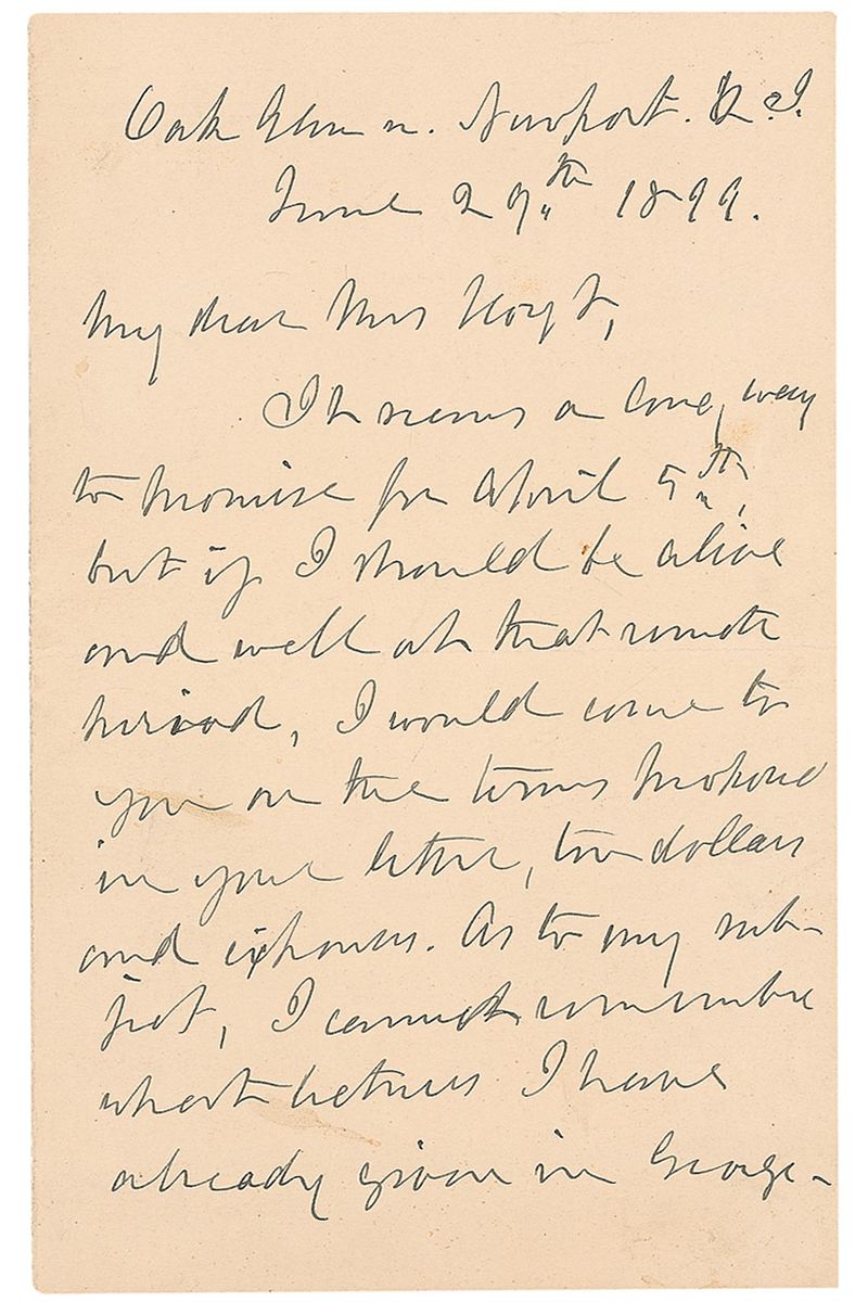 Author, suffragette, dramatist, poet, and biographer (1819–1910), best remembered as the lyricist of ‘Battle Hymn of the Republic.’ ALS, two pages on two adjoining sheets, 4.5 x 7, June 29, 1899. In full: “It seems a long way to promise for April 5th, but if I would be alive and well at that remote period, I would come to you on the terms proposed in your letter, ten dollars in expenses. As to my subject I cannot remember what lectures I have already given in Georgetown. If you will refresh my remembrance of those, I will offer you some others.” Affixed to a larger 8.5 x 11 sheet. In very good condition, with a central horizontal fold passing through the signature, light overall shade of toning, a few scattered spots of soiling, and tape at the hinge where it is affixed to the sheet.