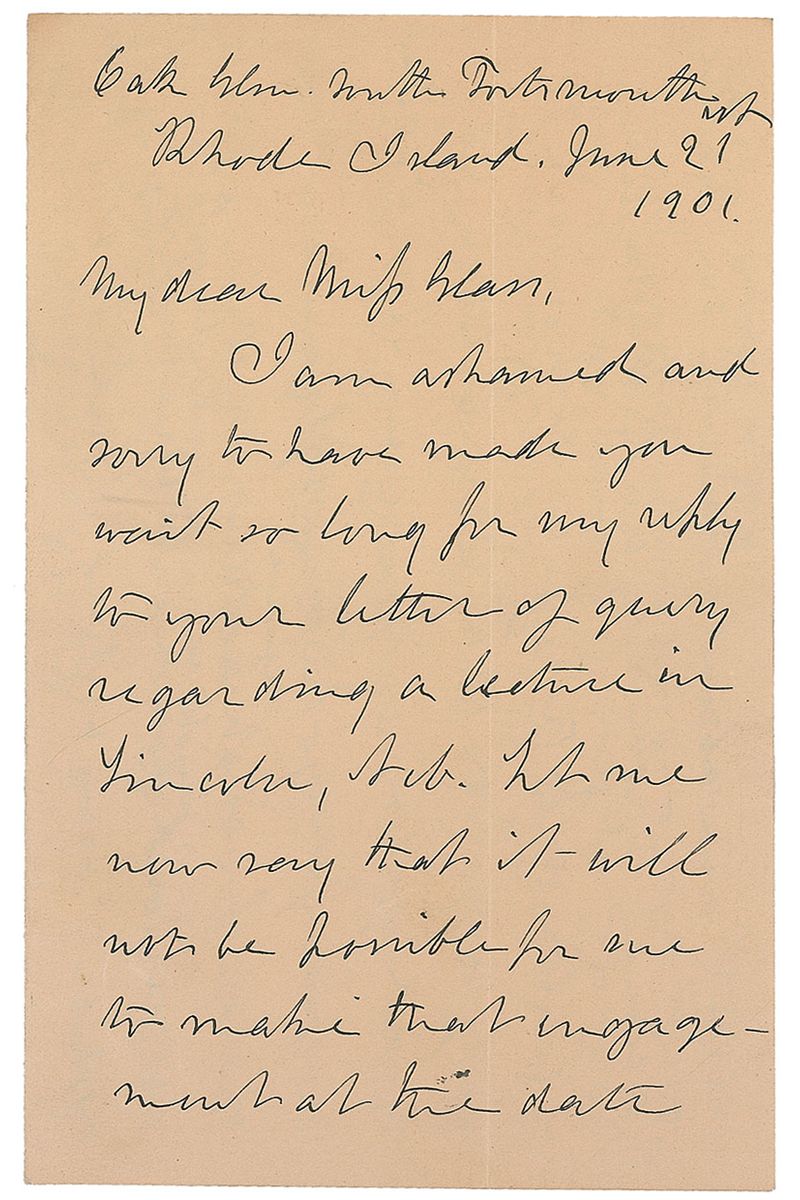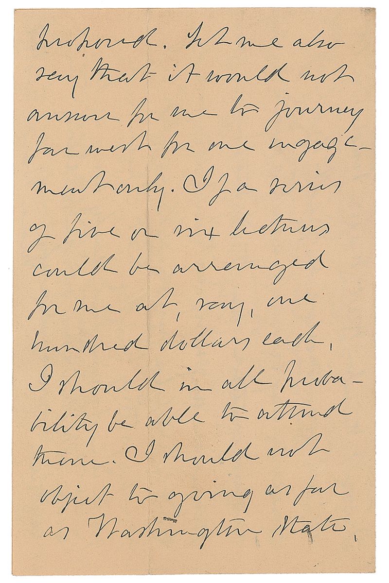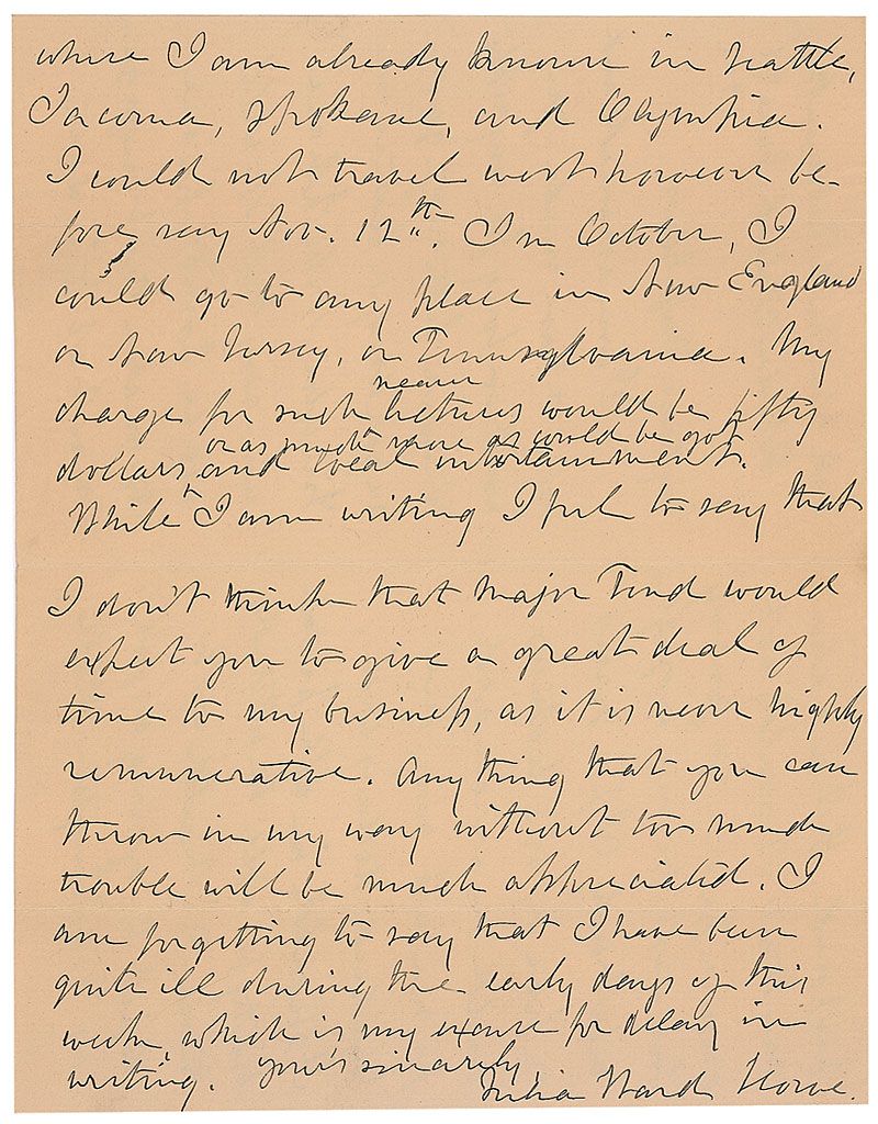 ALS, four pages on two adjoining sheets, 4.25 x 7, June 21, 1901. Response to an invitation to lecture in Lincoln, Nebraska. In part: “Let me now say that it will not be possible for me to make that engagement…it would not answer for me to journey far west for one engagement only. If a series of five or six lectures could be arranged for me at, say, one hundred dollars each, I should in all probability be able to attend them.” In fine condition. Accompanied by the original mailing envelope, addressed in Howe’s hand.