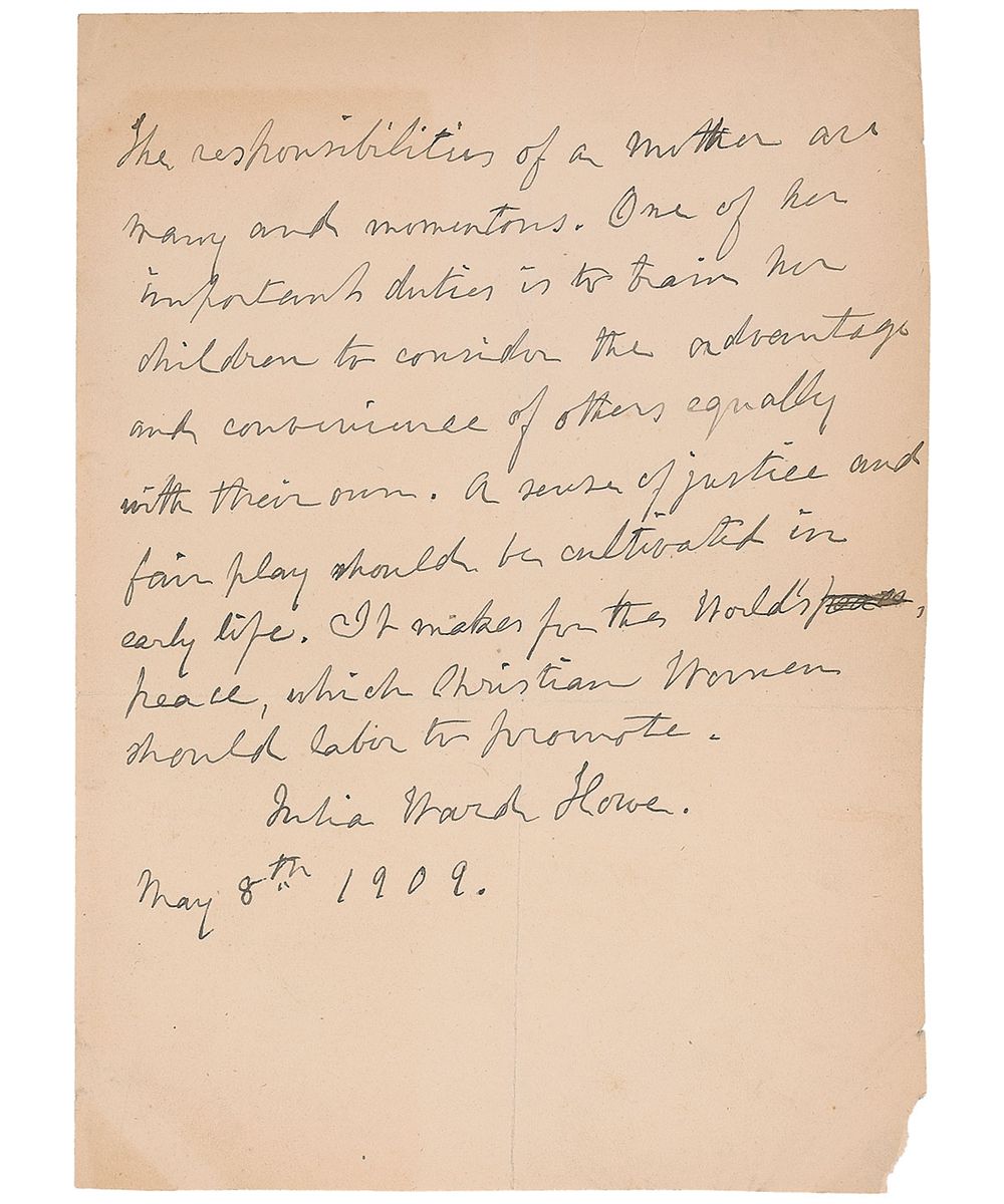 AQS on an off-white 5.5 x 7.75 sheet. Howe writes, in full, “The responsibilities of a mother are many and momentous. One of her important duties is to train her children to consider the advantage and convenience of others equally with their own. A sense of justice and fair play should be cultivated in early life. It makes for the world’s peace, which Christian women should labor to promote.” Signed at the conclusion, “Julia Ward Howe, May 8th, 1909.” In very good condition, with intersecting folds, scattered toning and creasing, and paper loss to lower right corner.