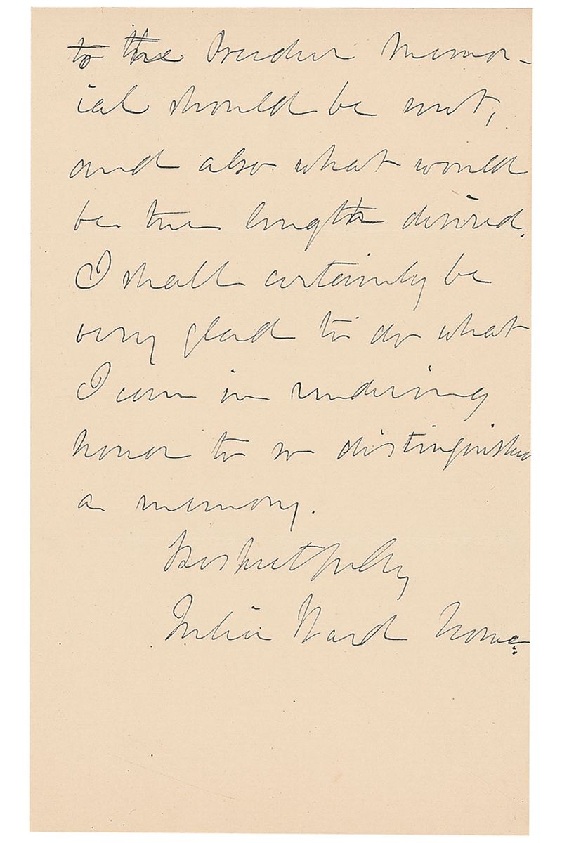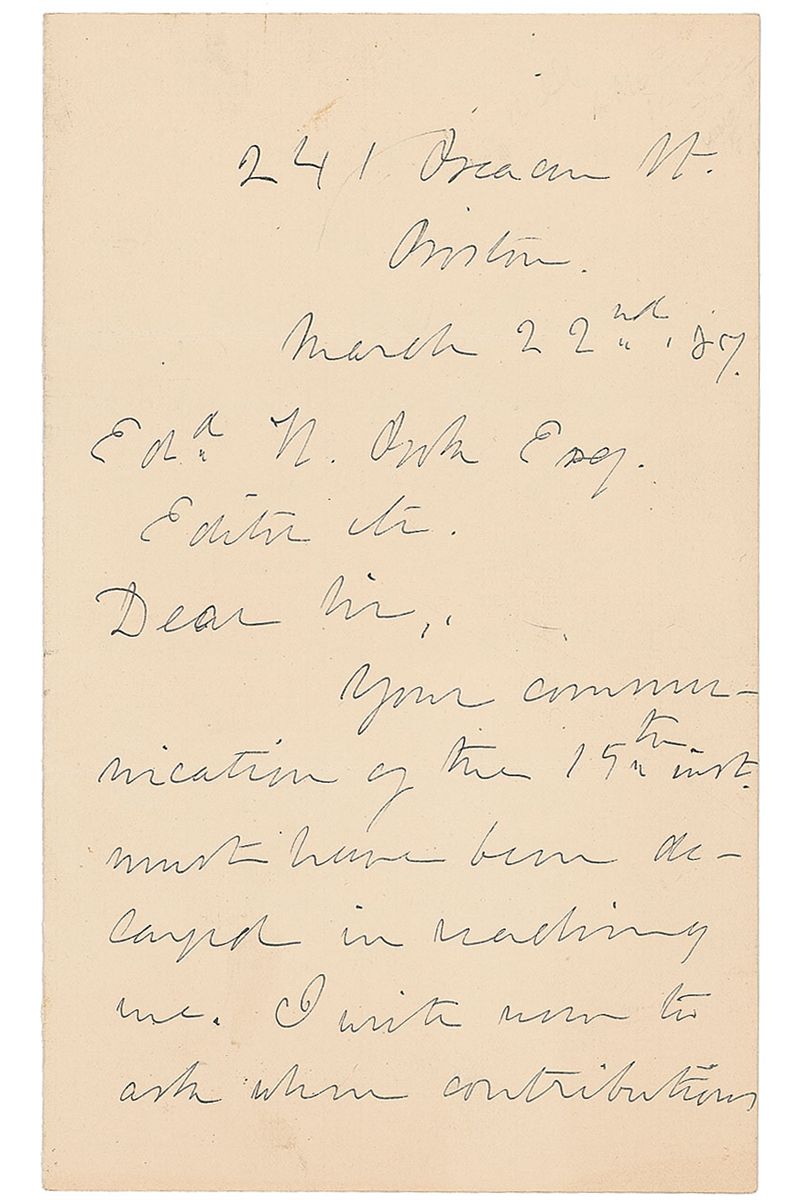 ALS, two pages on two adjoining sheets, 4.25 x 8, March 22, 1887. Letter to Edward W. Bok, editor of The Brooklyn Magazine. In part: “I write now to ask when contributions to the Beecher Memorial should be sent, and also what would be the length desired. I shall certainly be very glad to do what I can in rendering honor to so distinguished a memory.” In fine condition. Henry Ward Beecher had passed away on March 8, 1887, and Bok was compiling a series of memorial statements for the family.