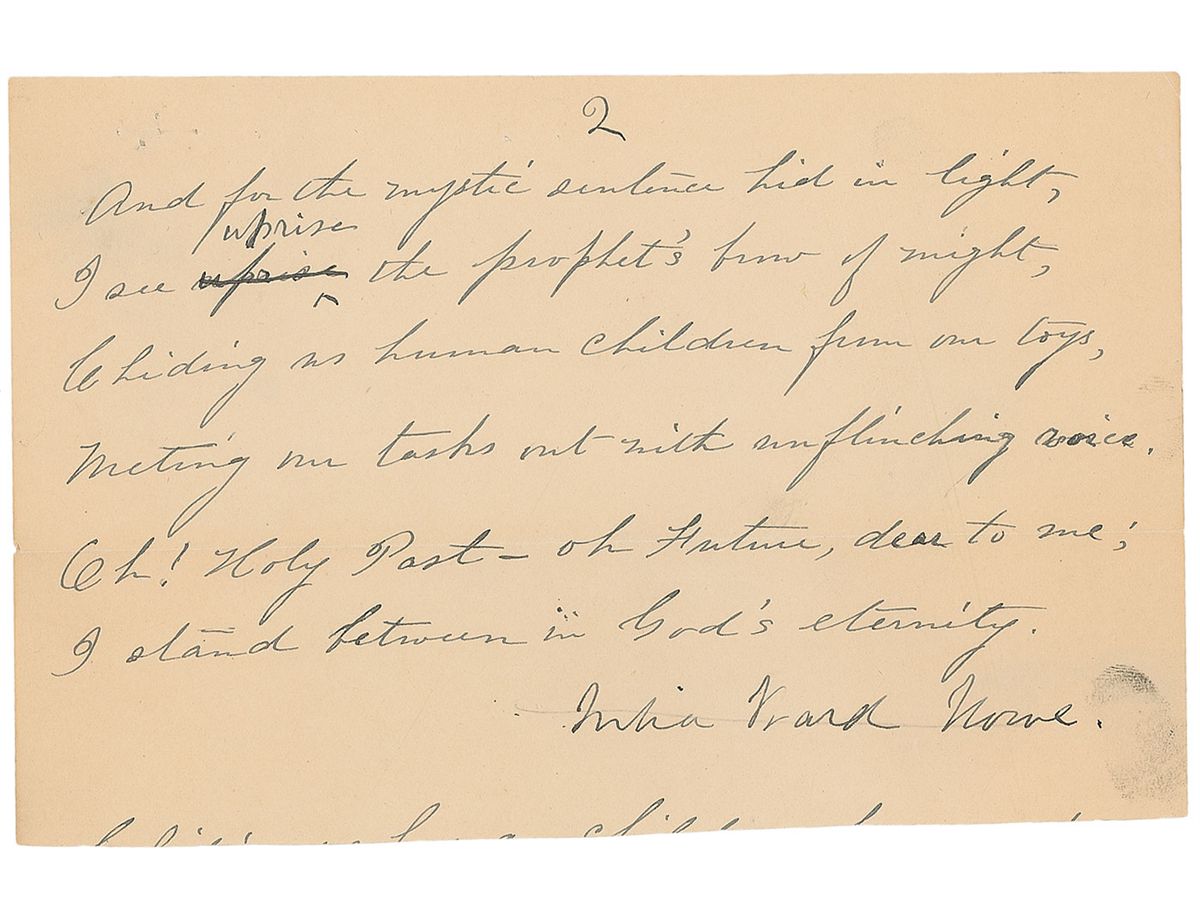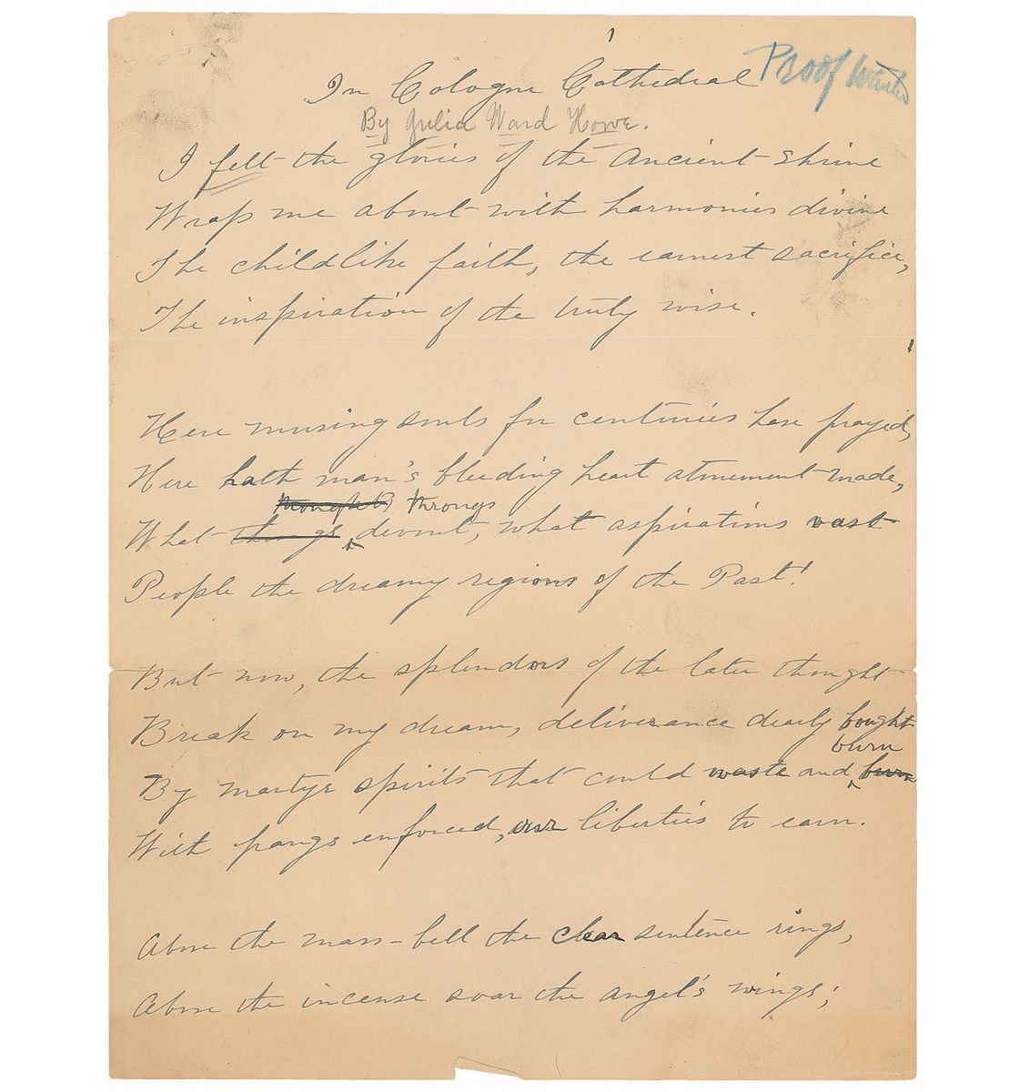 Autograph draft of a poem, signed “Julia Ward Howe,” two pages (7.75 x 10.25 and 7.75 x 5), no date. The poem, titled “In Cologne Cathedral,” reads in full: “I felt the glories of the ancient shrine / Wrap me about with harmonies divine / The childlike faith, the earnest sacrifice, / The inspiration of the truly wise. / Here missing souls for centuries have prayed, / Here hath man's bleeding heart atonement made, / What throngs devout, what aspirations vast / People the dreamy regions of the Past! / But now, the splendors of the later thought / Break on my dream, deliverance dearly bought / By martyr spirits that could waste and burn / With pangs enforced, our liberties to earn. / Above the mass-bell the clear sentence rings, / Above the incense soar the angel's wings / And for the mystic sentence hid in light, / I see uprise the prophet's brow of might / Chiding us human children from our toys, / Meeting our tasks out with unflinching voice / Oh! Holy Past—oh Future, dear to me; / I stand between in God's eternity.” There are corrections over several words, indicating that this was a draft of the final poem and not a commemorative copy. In very good condition, with trimming to second page, partial separations along horizontal folds, light toning, a few smudges, wrinkles, and pinholes, and a faint pencil stroke through signature.