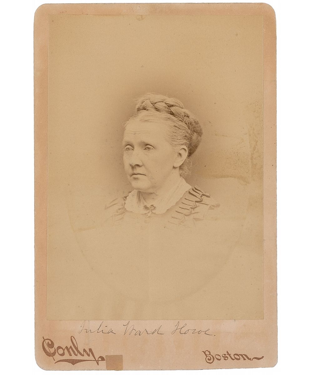 Author, suffragette, dramatist, poet, and biographer (1819–1910), best remembered as the lyricist of ‘Battle Hymn of the Republic.’ Uncommon 4.25 x 6.5 cabinet photo of Howe, by C. F. Conly of Boston, signed in the lower border in ink. Toning to borders affecting the lower portion of the signature, slight discoloration to right side of the image, and a small strip of toned tape to bottom, otherwise fine condition.