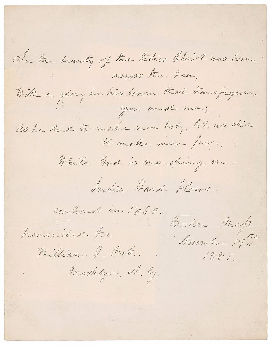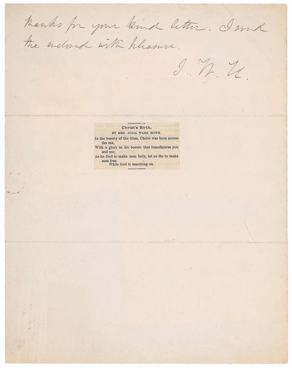 Desirable AQS on an off-white 7.75 x 10 sheet, signed and inscribed at the bottom, “Julia Ward Howe, Inscribed for William J. Bok, Brooklyn, N. Y., Boston, Mass., November 17th 1881.” Howe pens a stanza of her famous work, ‘The Battle Hymn of the Republic.’ In full: “In the beauty of the lilies Christ was born / across the sea, / With a glory in his bosom that transfigures / you and me; / As he died to make men holy, let us die / to make men free, / While God is marching on.” Below, she adds: “Composed in 1860.” She also pens an ANS on the reverse of the second integral page, signed “J. W. H.,” in full: “Thanks for your kind letter. I send the enclosed with pleasure.” A clipping of the text of this verse is also affixed to the reverse. In fine condition, with slight creasing to upper corners.
