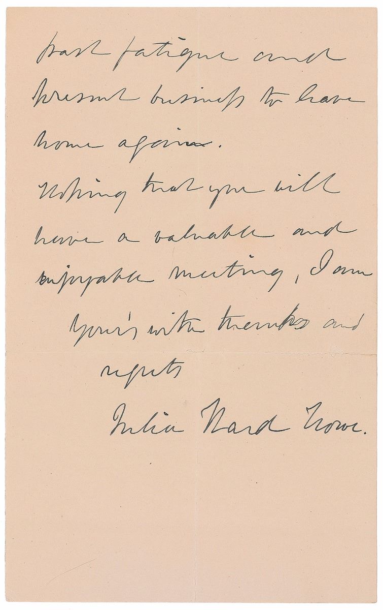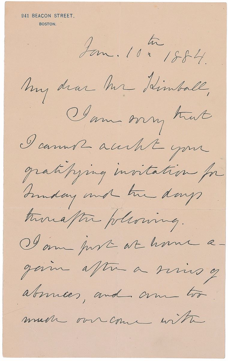 ALS, one page, 5 x 7.75, January 10, 1884. Letter to Mr. Kimball, in part: “I am sorry that I cannot accept your gratifying invitation for Sunday and the days thereafter following. I am just at home again after a series of absences, and am too much overcome with past fatigue and present business to leave home again.” In fine condition, with central vertical and horizontal folds, two small surface tears and partial separations to first page, and a tape-repaired separation to second page.