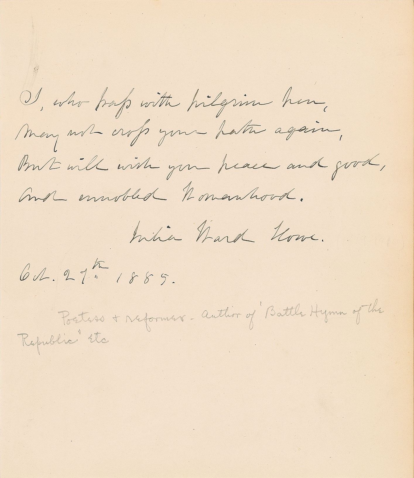 AQS on an off-white 6.25 x 7.25 sheet, signed and dated at the conclusion, "Julia Ward Howe, Oct. 27th 1885." Howe pens a poetic stanza, in full: "I, who pass with pilgrim here, / May not cross your path again, / But will wish you peace and good, / And ennobled Womanhood." In fine condition.