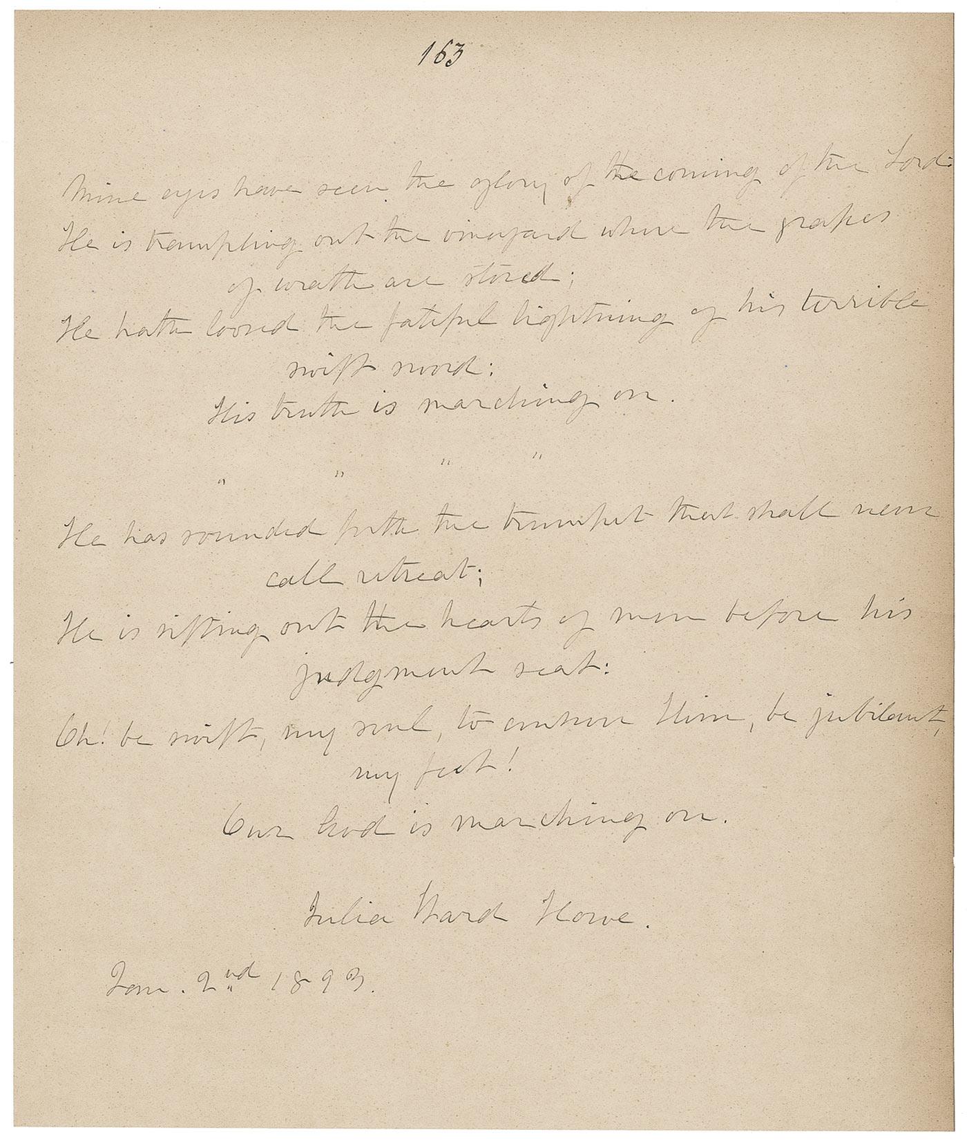 Desirable AQS on an 8.5 x 10 off-white sheet, signed “Julia Ward Howe, Jan. 2nd, 1893.” Howe writes out the first and fourth verses of “The Battle Hymn of the Republic”. In full: