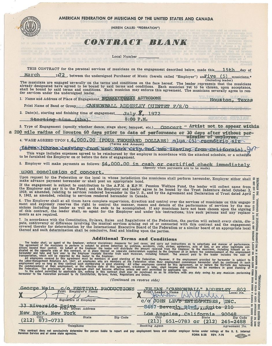DS, signed “Julian Adderley,” one page both sides, 8.5 x 11, March 15, 1972. Agreement for the Cannonball Adderley Quintet to perform at the Astrodome in Houston, Texas, on July 8, 1972, for $4000, listing the members of the band on the reverse. Signed at the conclusion in ballpoint by Adderley and countersigned by legendary jazz concert promoter George Wein. In fine condition.