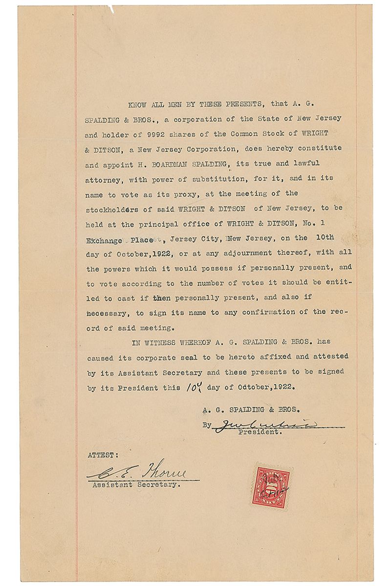 Pioneering promoter of golf in the United States and president of the Spalding sports equipment company (1858–1944), he designed the first basketball in association with James Naismith. Rare DS, signed “J. W. Curtiss,” one page, 8 x 13, October 10, 1922. A. G. Spalding & Bros. document appointing H. Boardman Spalding as “its true and lawful attorney, with power of substitution, for it, and in its name to vote as its proxy, at the meeting of the stockholders of…Wright & Ditson.” Signed at the conclusion by Curtiss as the company's president and countersigned by a secretary. In fine condition, with a tiny tear to top edge.