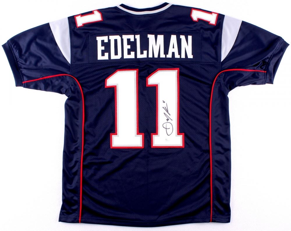 Custom on-field style jersey. Everything is sewn on, size XL. Hand-signed in black felt-tip pen by Julian Edelman (Patriots). The autograph includes an official James Spence Authentication (JSA) hologram and matching COA for authenticity purposes.