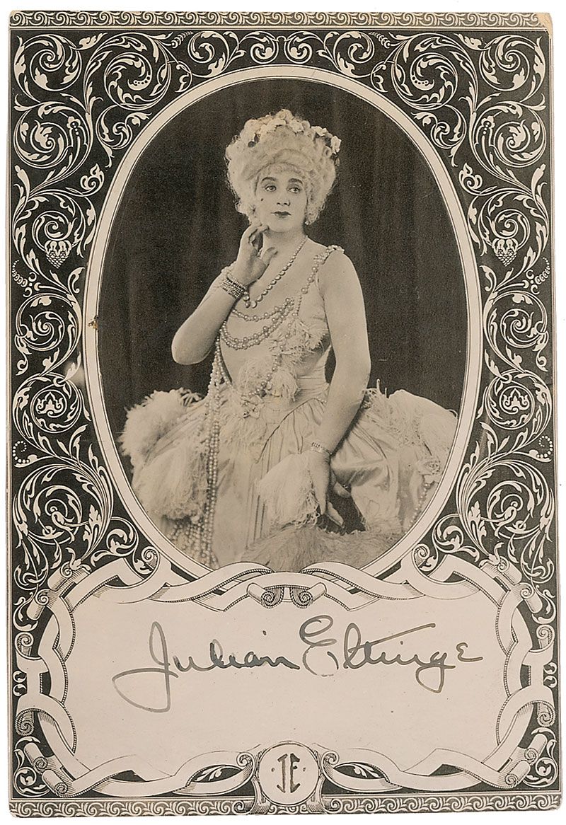 Stage and screen actor (1881–1941) who was the most famous female impersonator of all-time. Vintage matte-finish 4 x 5.75 photo of Eltinge dressed as a female, signed in the lower border in black ink. In fine condition.