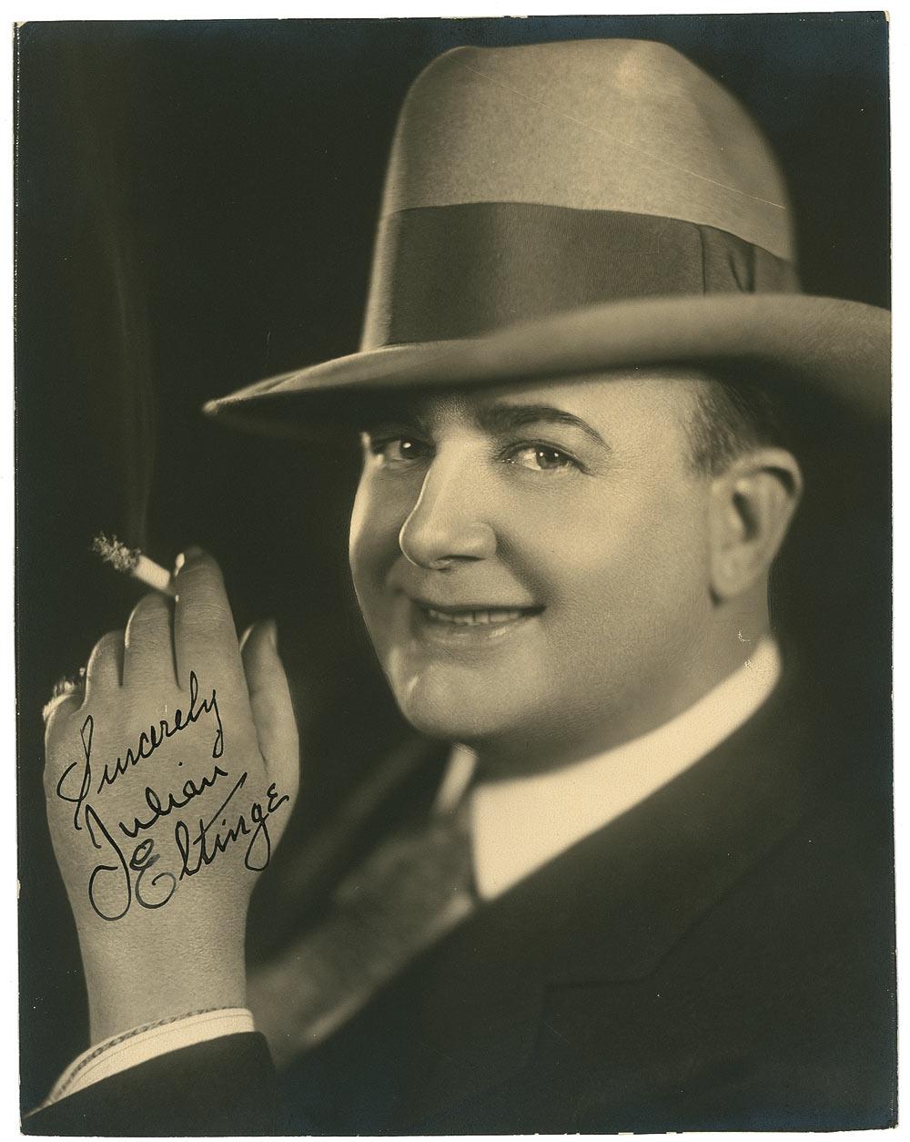 The most famous female impersonator of all time. His beauty caused him to be dubbed the Mr. Lillian Russell of his day. W.C. Fields is quoted as having said of Eltinge, “Women went into ecstasies over him. Men went into the smoking room.” Vintage matte-finish 7.75 x 10 head-and-shoulders photo of the masculine-looking Eltinge holding a smoldering cigarette, signed in fountain pen. In fine condition, with possible lightly trimmed edges, and light silvering to dark background.