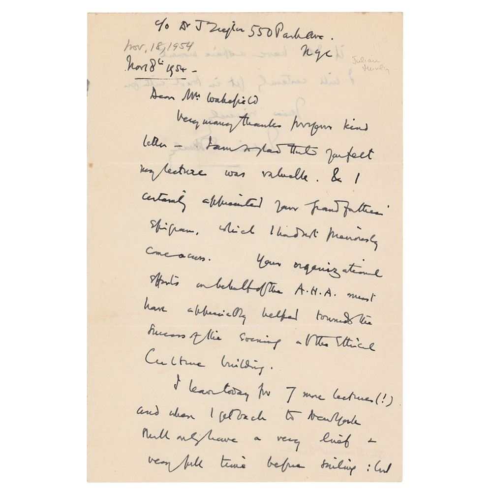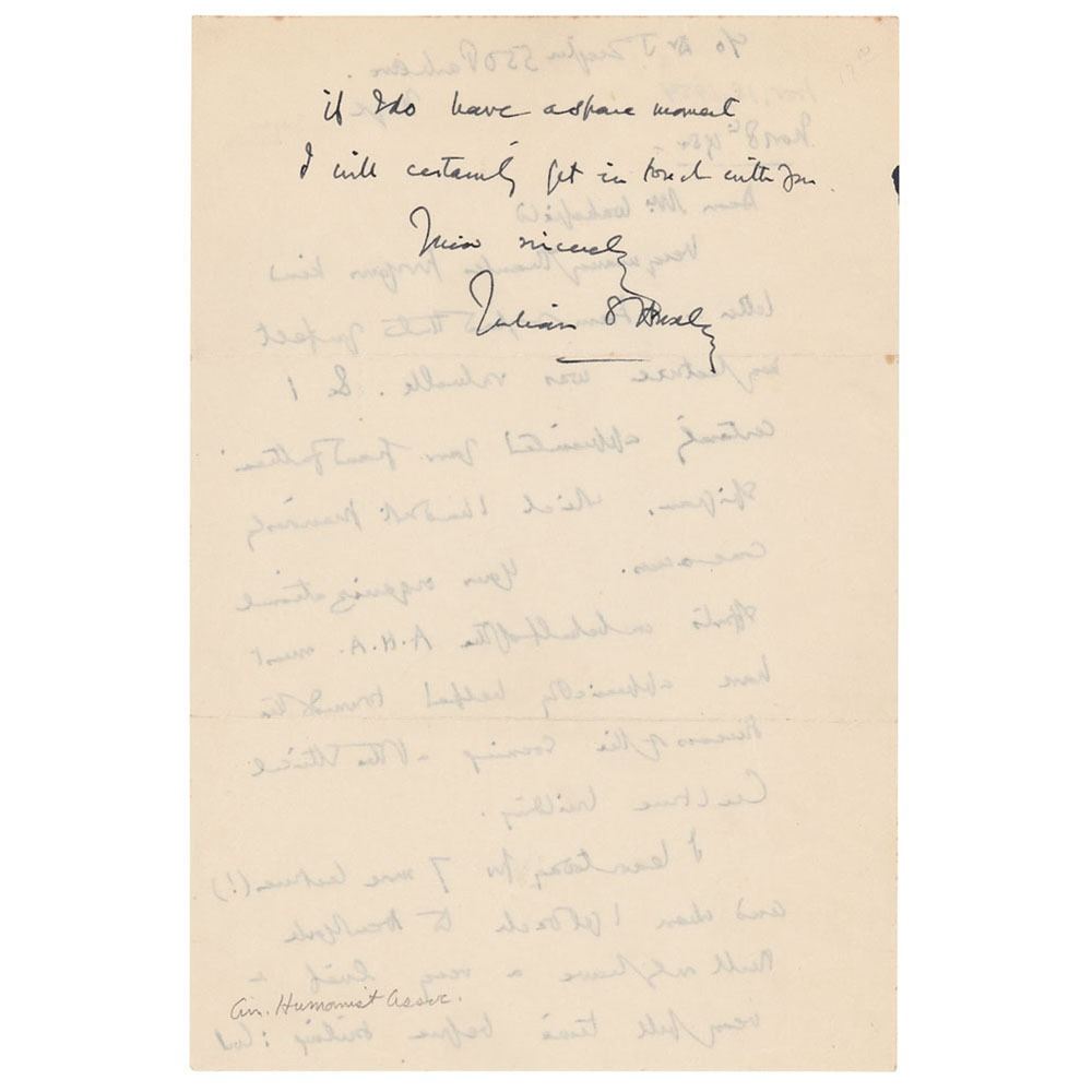 ALS signed “Julian S. Huxley,†one page both sides, 6 x 8.75, November 18, 1954. Handwritten letter to Mr. Wakefield of the American Humanist Association, in part: "I am so glad that you felt my lecture was valuable…your organizational efforts on behalf of the A.H.A. must have appreciably helped toward the success of the evening at the Ethical Culture Building. I leave today for 7 more lectures (!) and when I get back to New York shall only have a very brief & very full time before sailing." In fine condition.