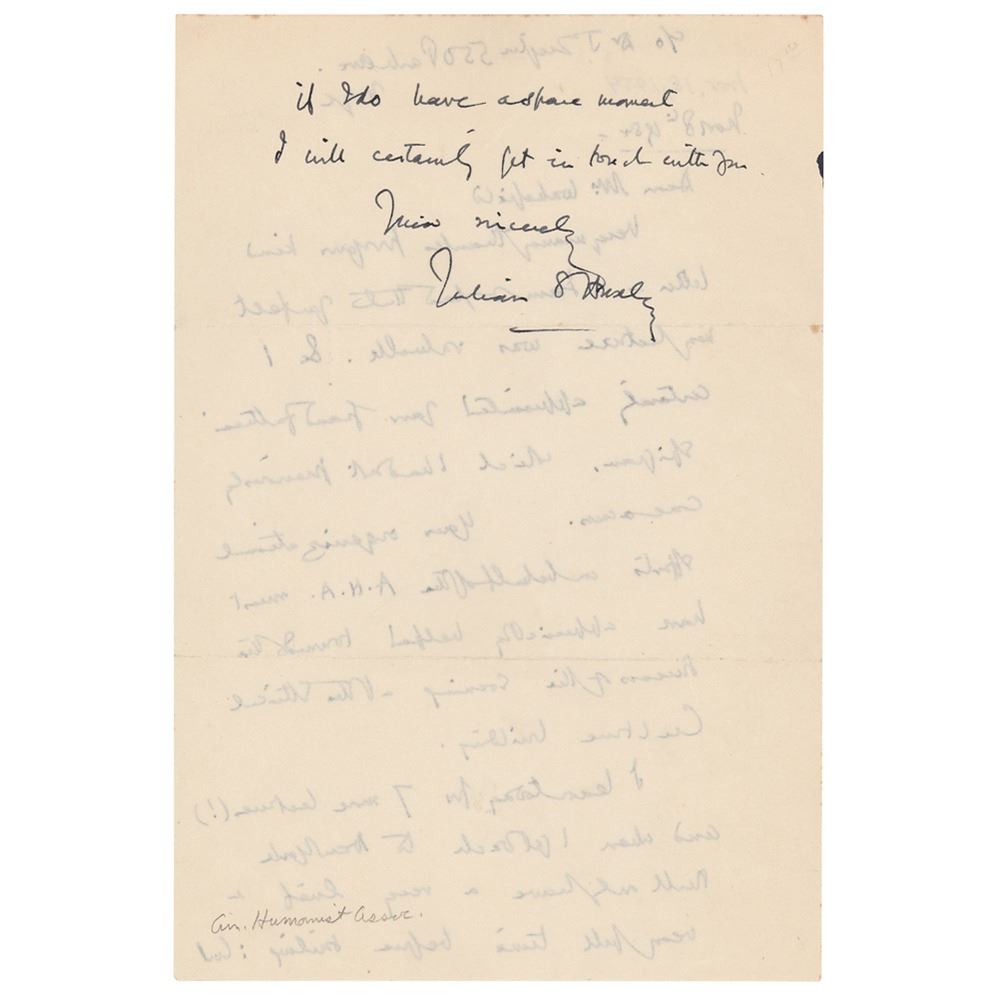 ALS signed “Julian S. Huxley,†one page both sides, 6 x 8.75, November 18, 1954. Handwritten letter to Mr. Wakefield of the American Humanist Association, in part: "I am so glad that you felt my lecture was valuable…your organizational efforts on behalf of the A.H.A. must have appreciably helped toward the success of the evening at the Ethical Culture Building. I leave today for 7 more lectures (!) and when I get back to New York shall only have a very brief & very full time before sailing." In fine condition.