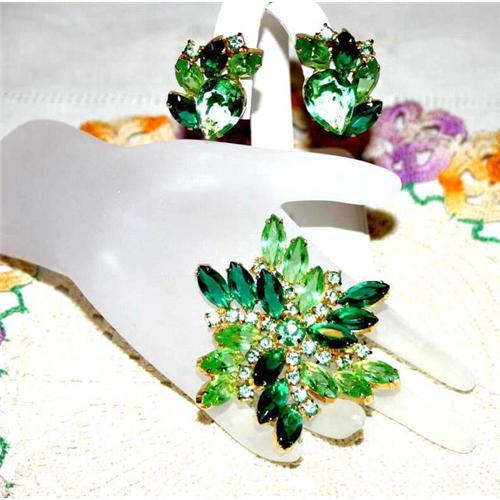 A fabulous Vintage Juliana 1950s Rhinestone Brooch or Pin and Earrings set by DeLizza Elster! The Brooch or Pin consists of a Pinwheel design of Deep Emerald Green and Peridot unfoiled Navette Rhinestones enter-mixed with Chaton Emerald Green Rhinestones. Stunning and two dimensional with the Navettes turning slightly up. Measuring 2 1/2 inches in diameter. All Rhinestones are hand set in prongs in a gold plated finish. The matching Earrings repeat the same motif as the Brooch measuring 1 1/4 inches long by 1 inch wide with one very unfoiled Tear-drop Emerald Green Rhinestone, measuring 1 1/4 inches long by 1 inch wide and securing with a clip-back closure. Fabulous sparkling with the different depths of Green Rhinestones. A true work of art produced by Juliana!