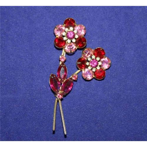 <table width="100%" border="0" cellspacing="0" cellpadding="4"><tr><td><em> A FABULOUS FIND!</em></td></tr><tr> <td width="100%"> Produced in the 1950s by D & E Juliana Jewelry Company this luscious vintage Flower Bouquet Brooch was created using large Pink Ruby Red and Fuchsia Chaton Rhinestones with tiny Crystal Chaton center and large Fuchsia Navette leaves. All stones are open back and prong-set in a gold plated metal. Measuring 3 ½ inches long by 2 inches wide; weighty and very well made, appearing to be unworn!