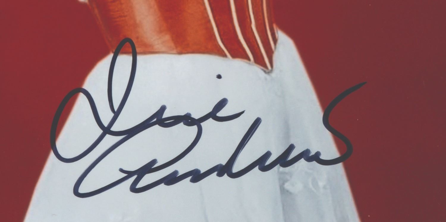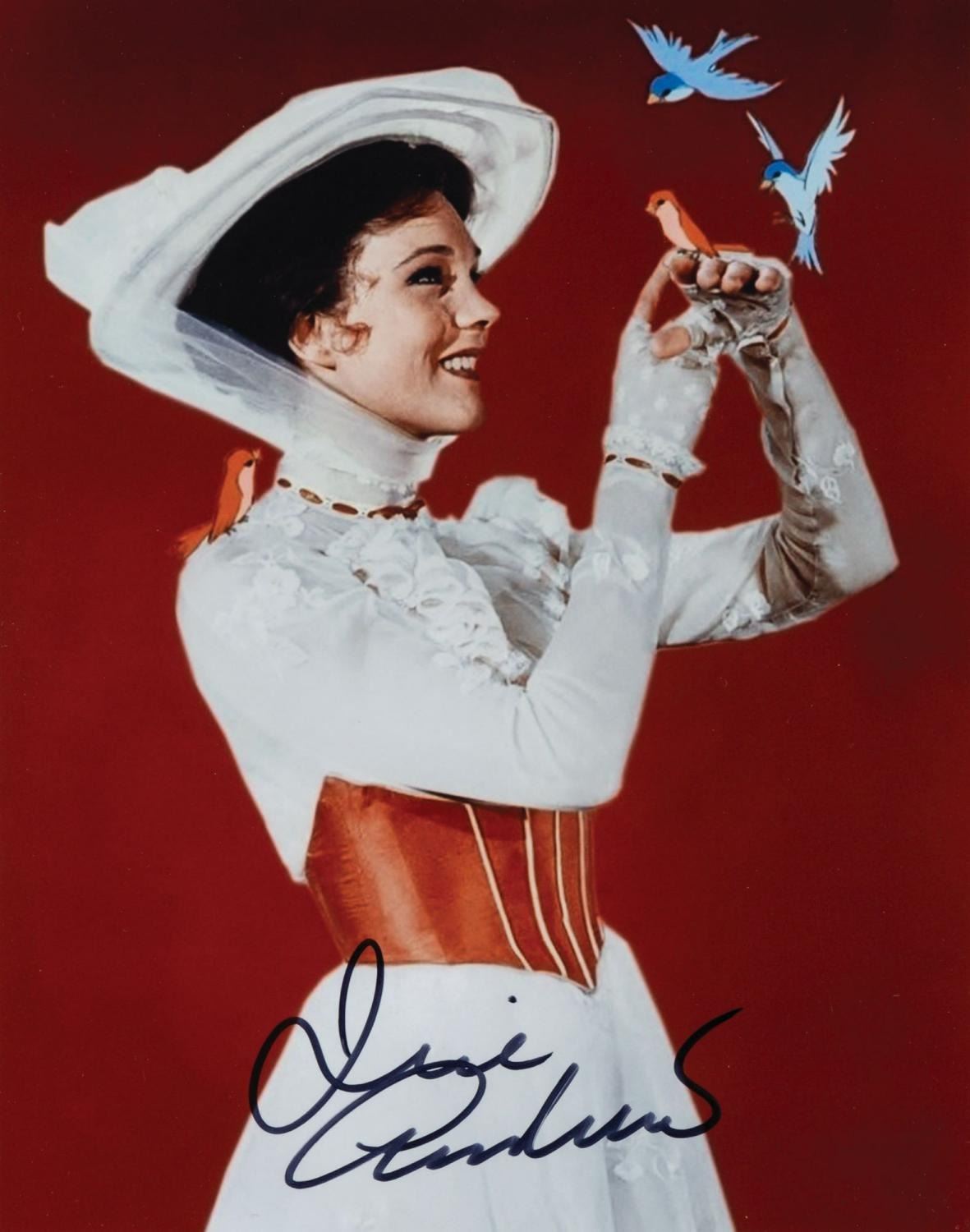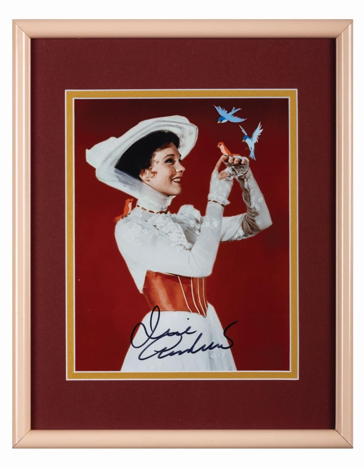 (Disney, 1964/Printed Later) A signed color photograph of Julie Andrews from the "Jolly Holiday" segment of Mary Poppins. Andrews has signed in black ink in the lower central portion of the photo, "Julie Andrews." Measuring 7.5"x9.25" visible through a double mat within a 15"x12" pink lacquered wood frame, the piece appears to be in fine condition. The frame itself is virtually unhandled.