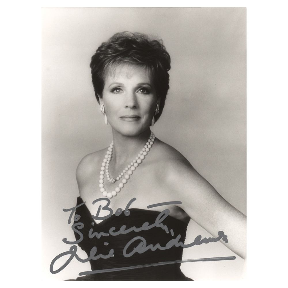 Satin-finish 6 x 8 photo of Andrews in a formal gown and twin strands of pearls, signed and inscribed in silver ink, "To Bob—Sincerely, Julie Andrews.” In very fine condition.