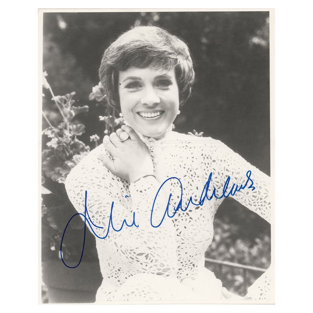Glossy 8 x 10 photo of Julie Andrews in a lacy white top, signed in blue felt tip. In fine condition, with two very thin scratches passing across the center of the image. Originally obtained by in-person specialist Mike Wehrmann.