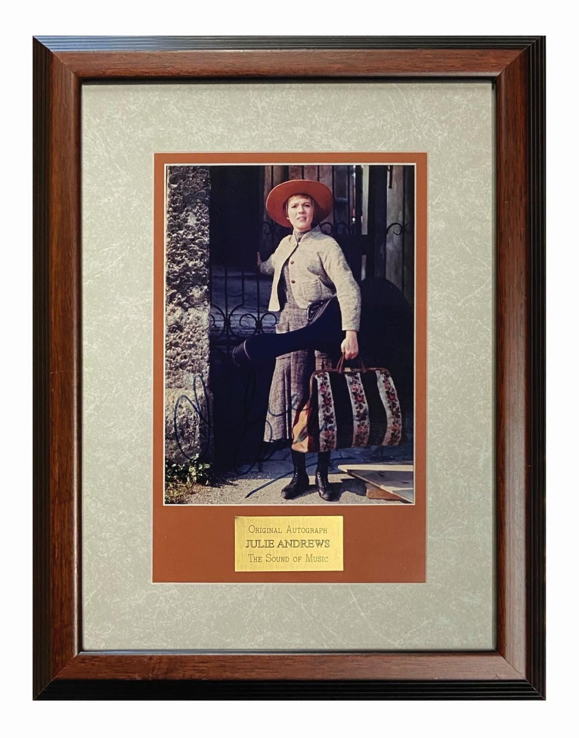 (Walt Disney World, c.1990s) A beautiful Julie Andrews signed photograph featuring an image of the actress as Maria in The Sound of Music. Signed by Andrews in bold black ink, the photograph was sold by the Walt Disney World Co. and purchased by a WDW cast member at the time. The reverse still bears the guarantee of authenticity and a Walt Disney World Co. seal. Measuring approximately 9.5"x6.75" in its 18.75"x14.25" frame, the photograph is in very good condition. There is slight fading to the signature from age. The frame shows minor wear from previous display.