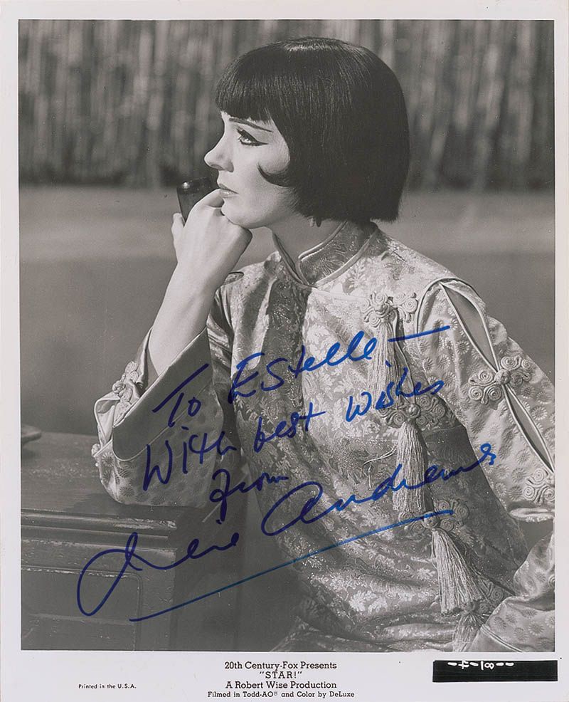 Glossy 8 x 10 20th Century Fox promotional photo of Andrews in Star!, signed and inscribed in blue felt tip “To Estelle—With best wishes from Julie Andrews.” A few light creases and scattered crazing to the emulsion, otherwise fine condition.