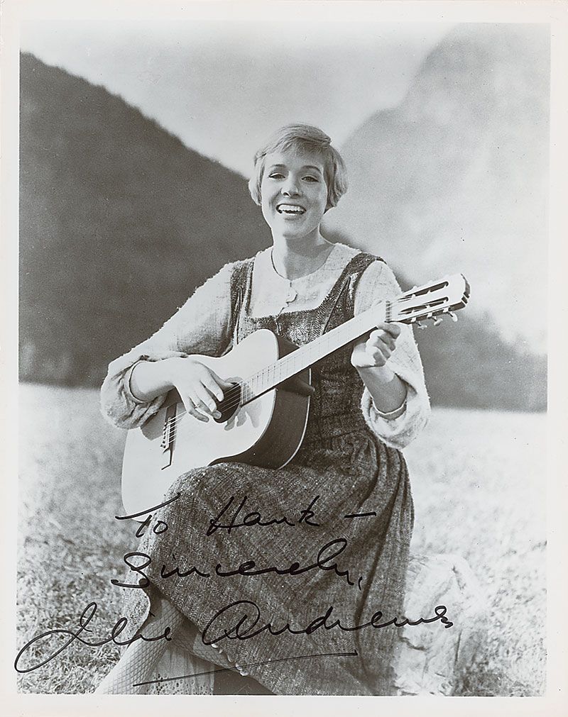 Glossy 8 x 10 photo of Andrews singing in The Sound of Music, signed and inscribed in black felt tip, “To Hank—Sincerely, Julie Andrews.” In fine condition.
